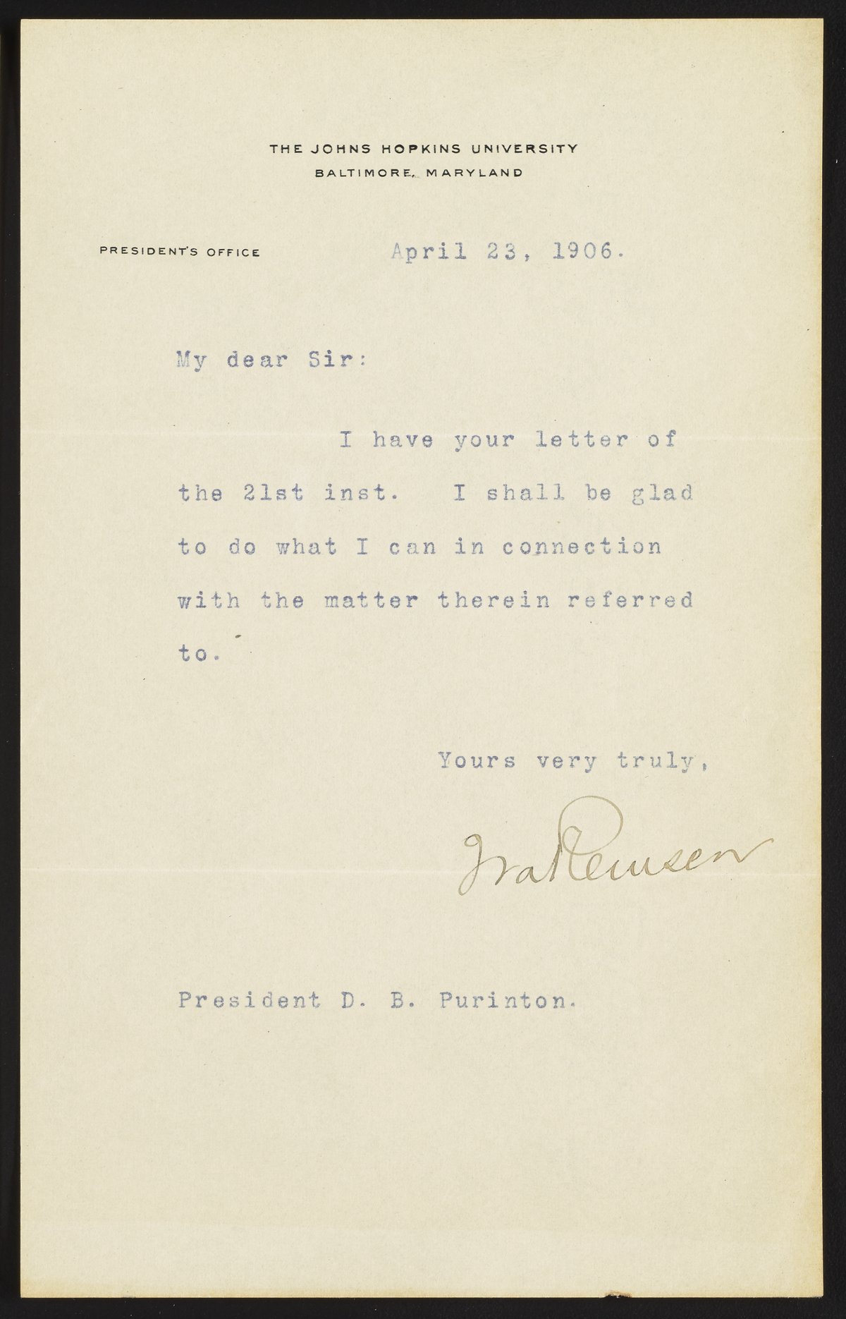Letter from Ira Remsen to D. B. Purinton