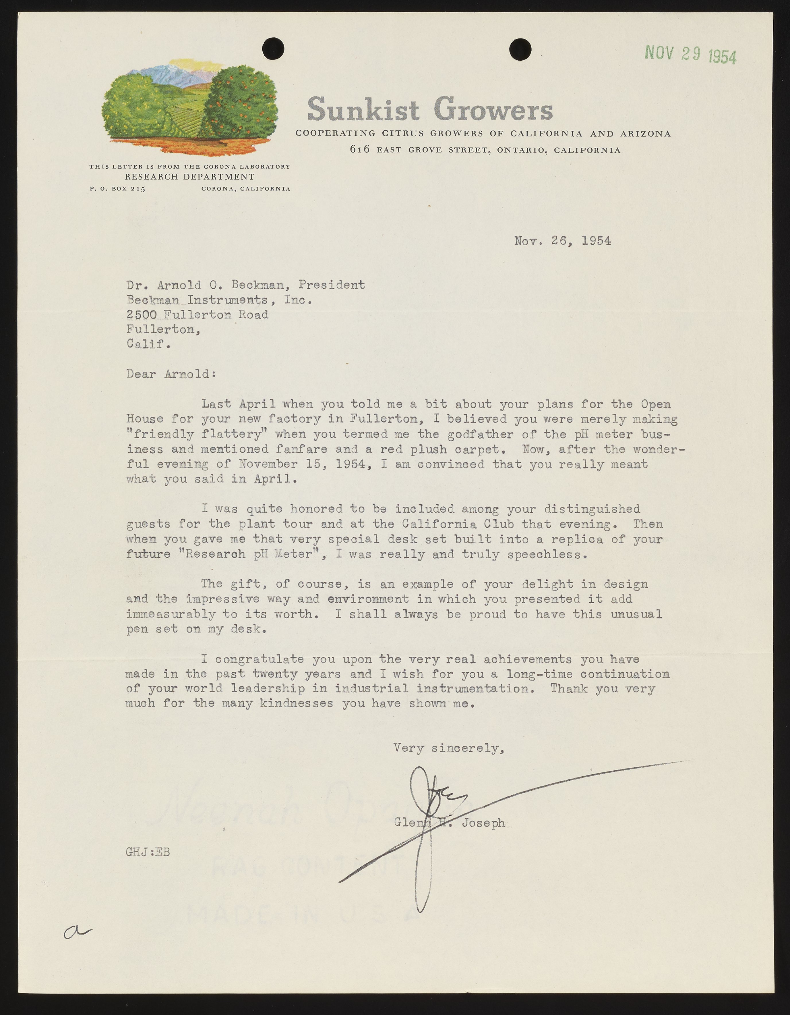 Joseph, Glenn H. “Letter from Glenn H. Joseph to Arnold O. Beckman,” November 26, 1954. Beckman Historical Collection, Box 10, Folder 12. Science History Institute. Philadelphia. https://digital.sciencehistory.org/works/8s45q963q.