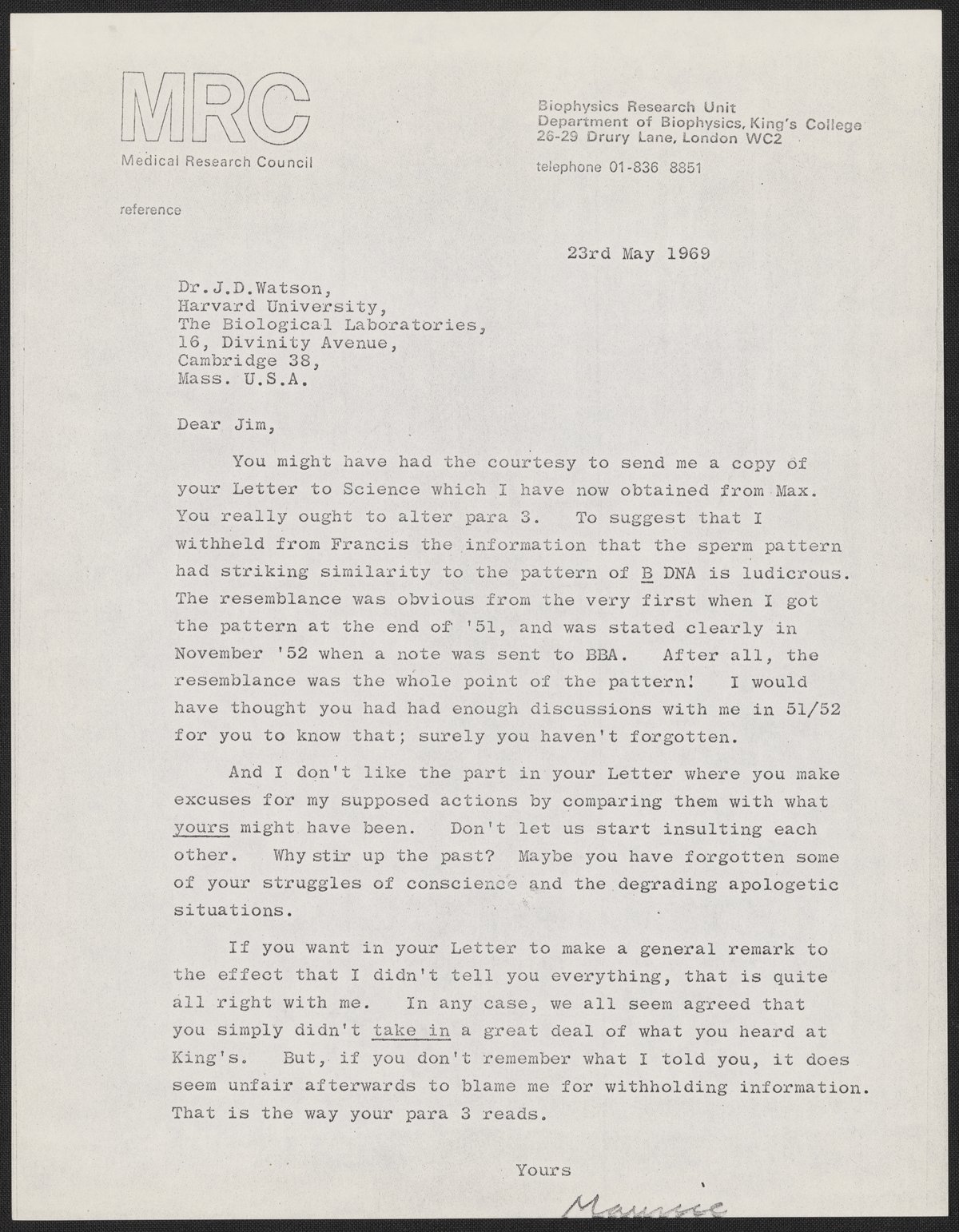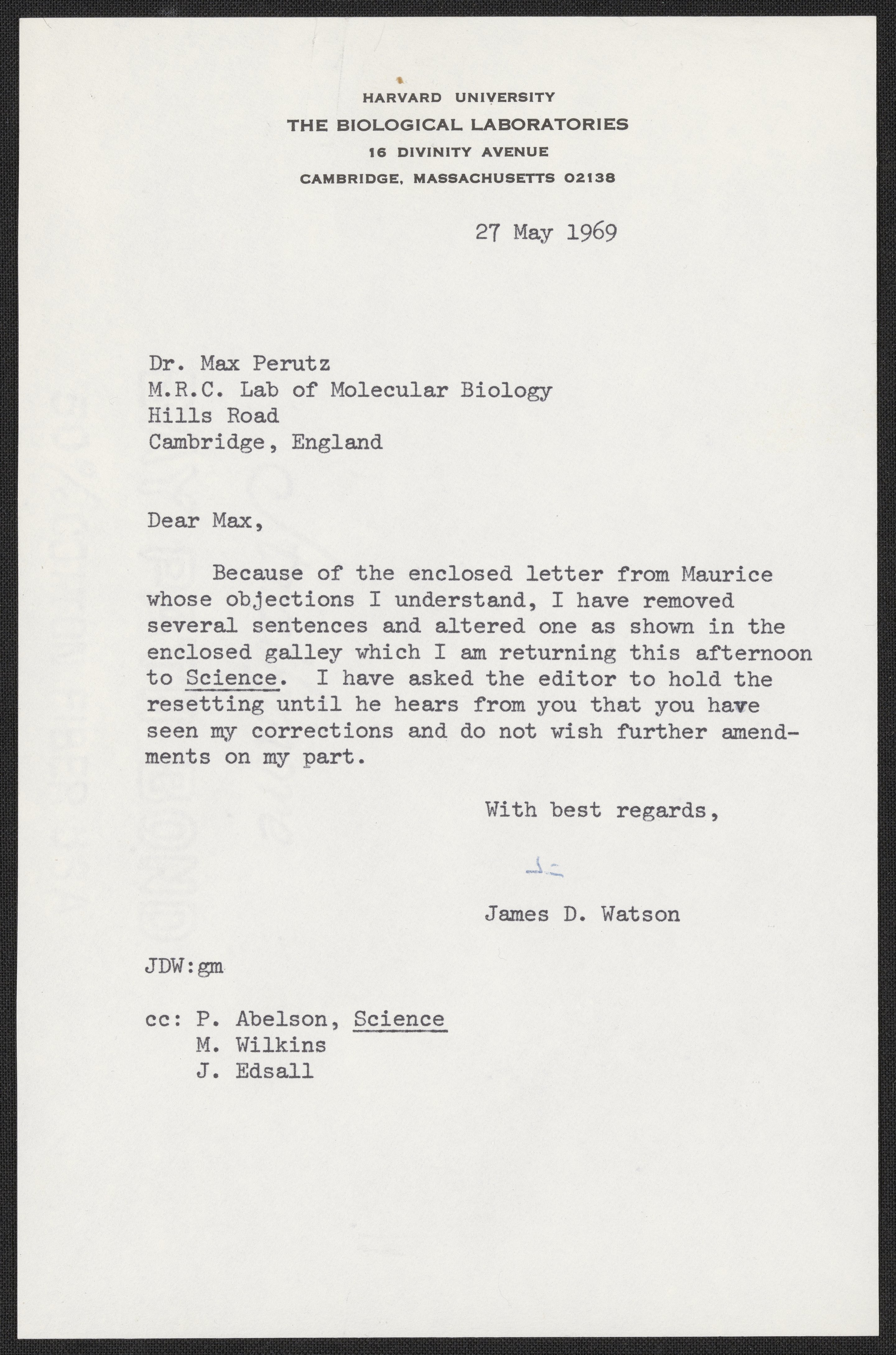 Watson, James D. “Letter from James D. Watson to Max Perutz, May 27, 1969,” May 27, 1969. History of Molecular Biology Collection, Box 88, Folder 3. Science History Institute. Philadelphia. https://digital.sciencehistory.org/works/8smrd02.