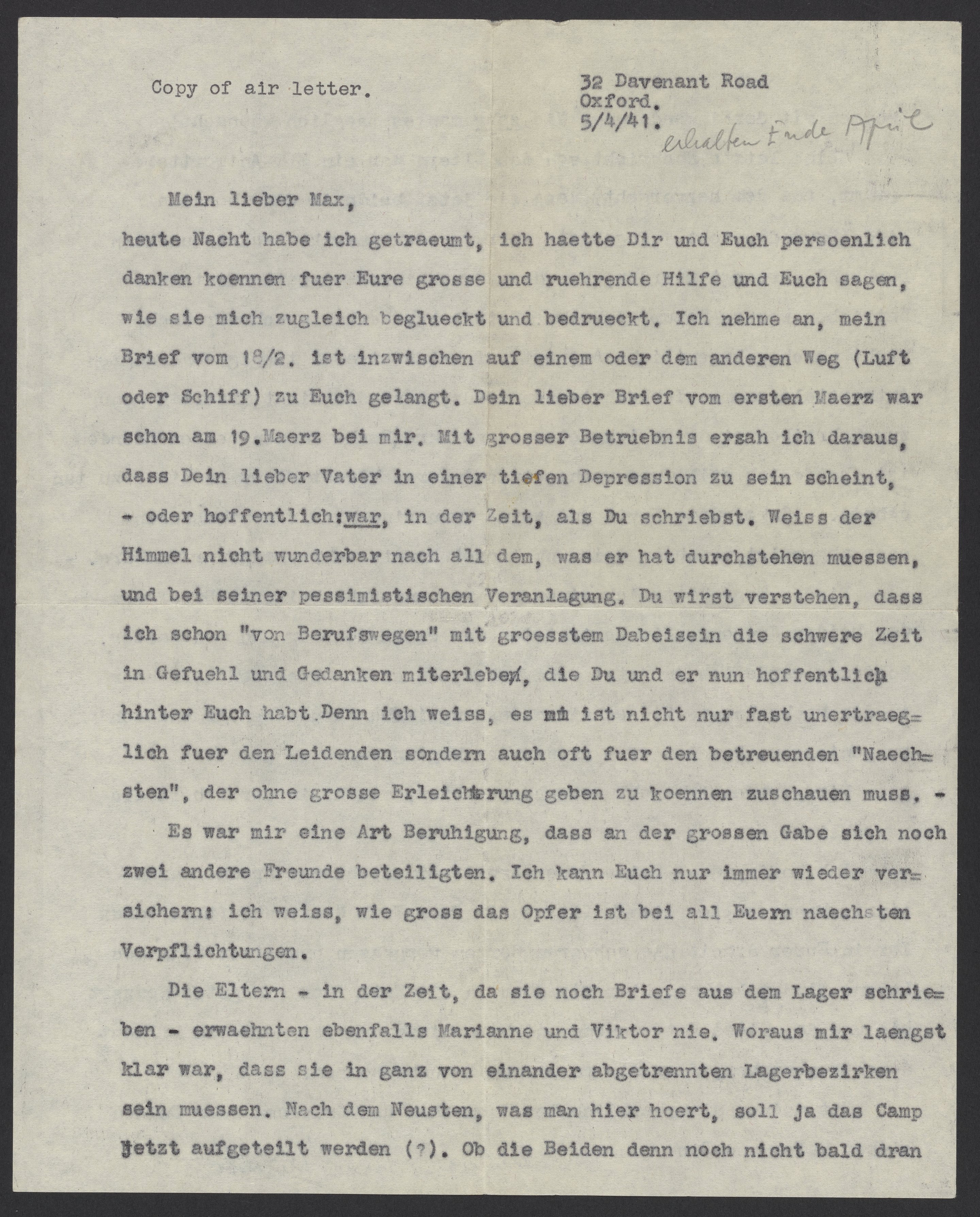 heute Nacht habe ich getraeumt, ich haette Dir und Euch persoenlich danken koennen fuer Eure grosse und ruehrende Hilfe und Euch sagen, wie sie mich zugleich beglueckt und bedrueckt. Ich nehme an, mein Brief vom 18/2. ist inzwischen auf einem oder dem anderen Weg (Luft oder Schiff) zu Euch gelangt. Dein lieber Brief vom ersten Maerz war schon am 19. Maerz bei mir. Mit grosser Betruebnis ersah ich daraus, dass Dein lieber Vater in einer tiefen Depression zu sein scheint – oder hoffentlich: war, in der Zeit als Du schriebst. Weiss der Himmel nicht wunderbar nach all dem, was er hat durchstehen muessen und bei seiner pessimistischen Veranlagung. Du wirst verstehen, dass ich schon von “Berufswegen” mit grosstem Dabeisein die schwere Zeit in Gefuehl und Gedanken miterlebe, die Du und er nun hoffentlich hinter Euch habt. Denn ich weiss, es ist nicht nur fast unertraeglich fuer den Leidenden sondern auch oft fuer den betreuenden “Naechsten”, der ohne grosse Erleichterung geben zu koennen zuschauen muss.