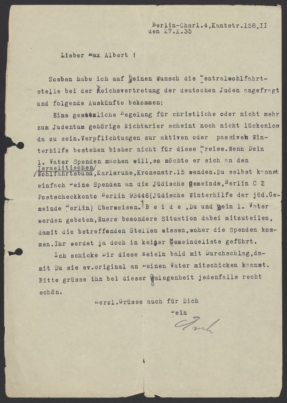 Letter to Max Bredig regarding donations to the Jewish Winter Relief Fund, October 27, 1935