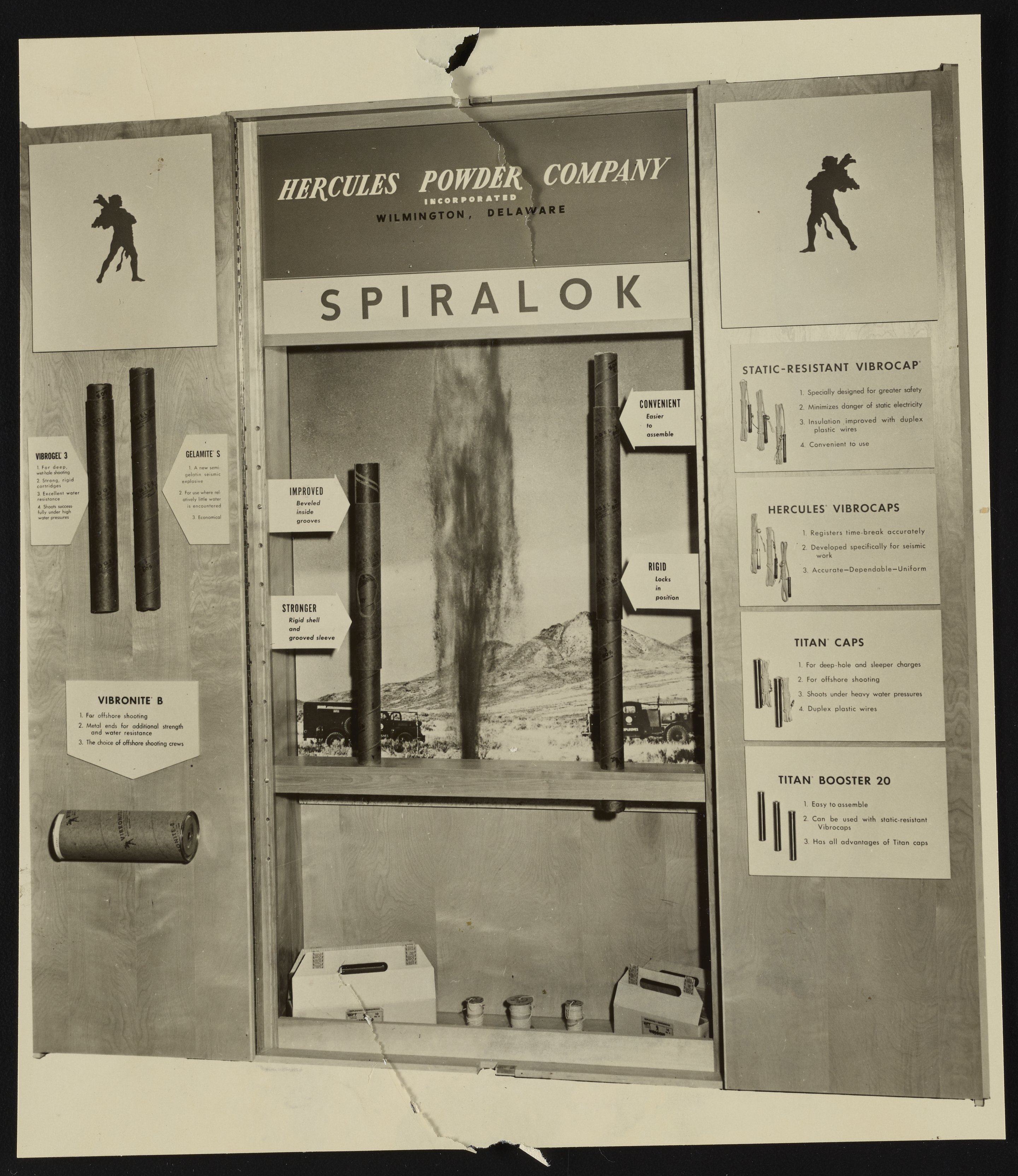General view of an exhibition display for Spiralok cartridges manufactured and sold by the Hercules Powder Company for use with Vibrogel explosives and Vibrocap blasting caps.