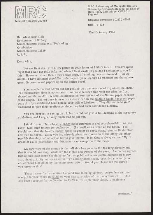 Letter from Francis Crick to Alexander Rich, October 22, 1974