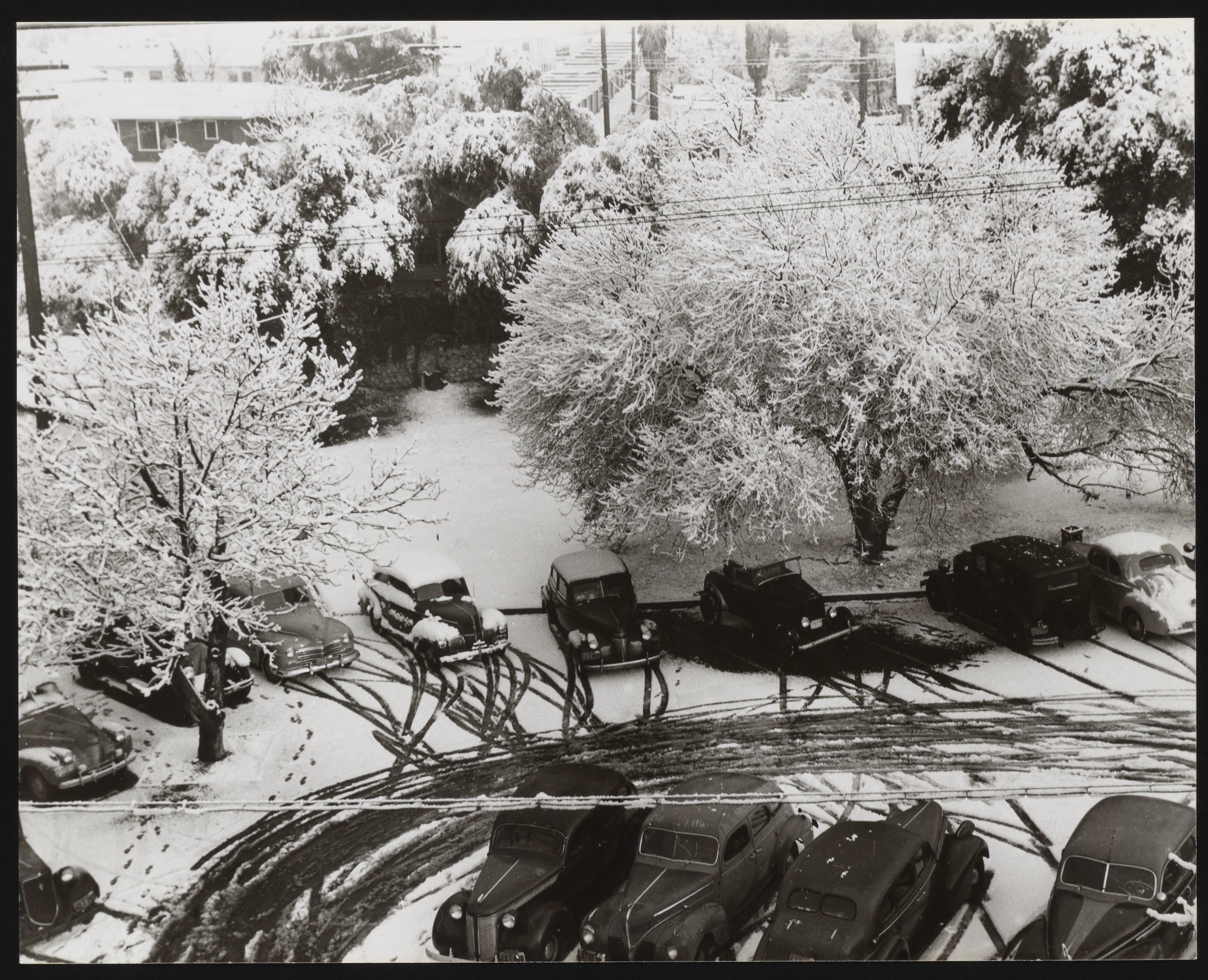 Rohrer, Larry. “Parking Lot on the North Side of National Technical Laboratories.” National Technical Laboratories in Winter, 1948. Beckman Historical Collection, Box 55, Folder 95. Science History Institute. Philadelphia. https://digital.sciencehistory.org/works/8w32r590n.