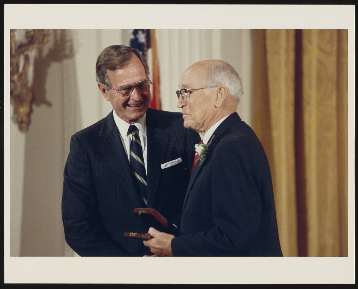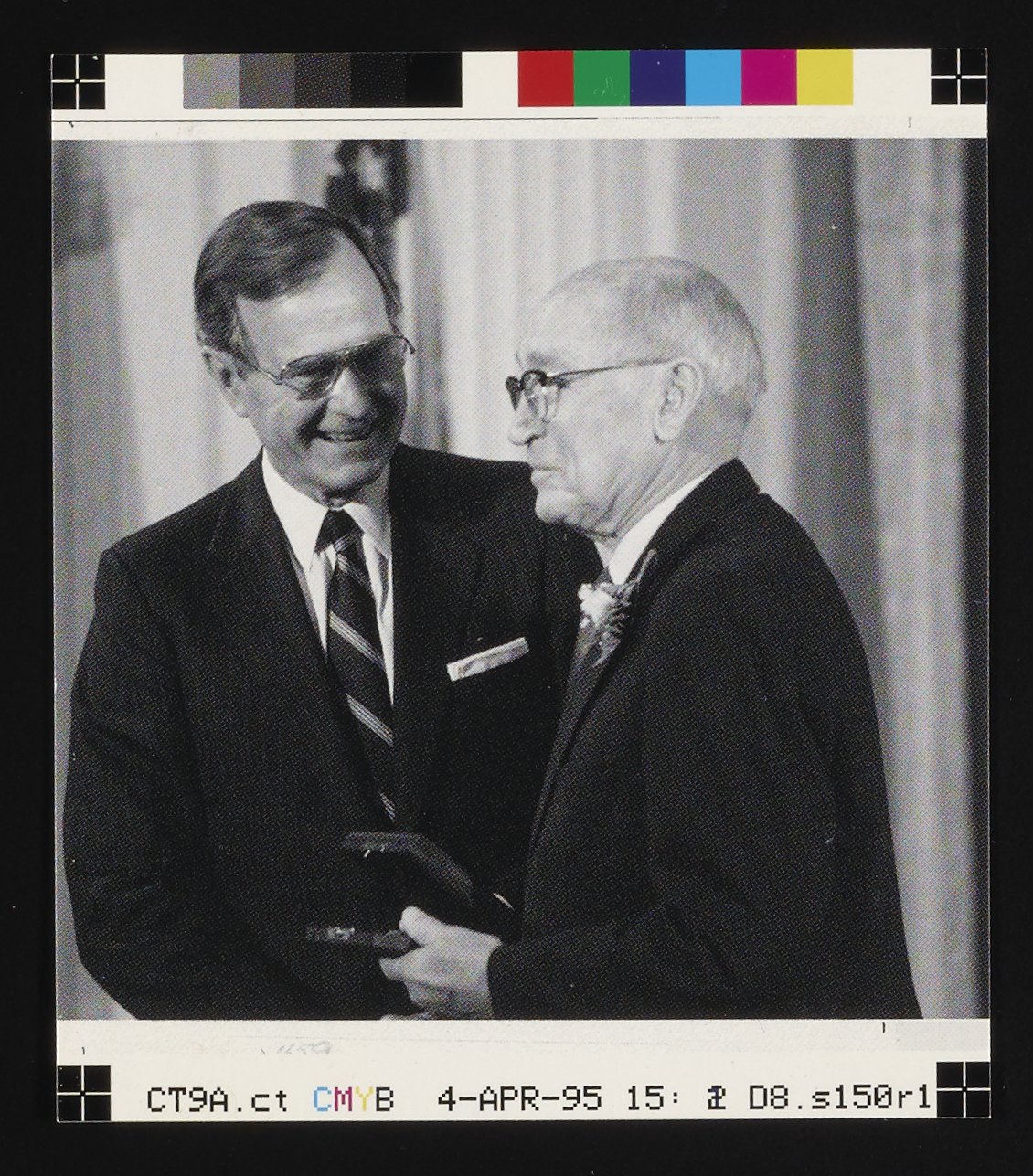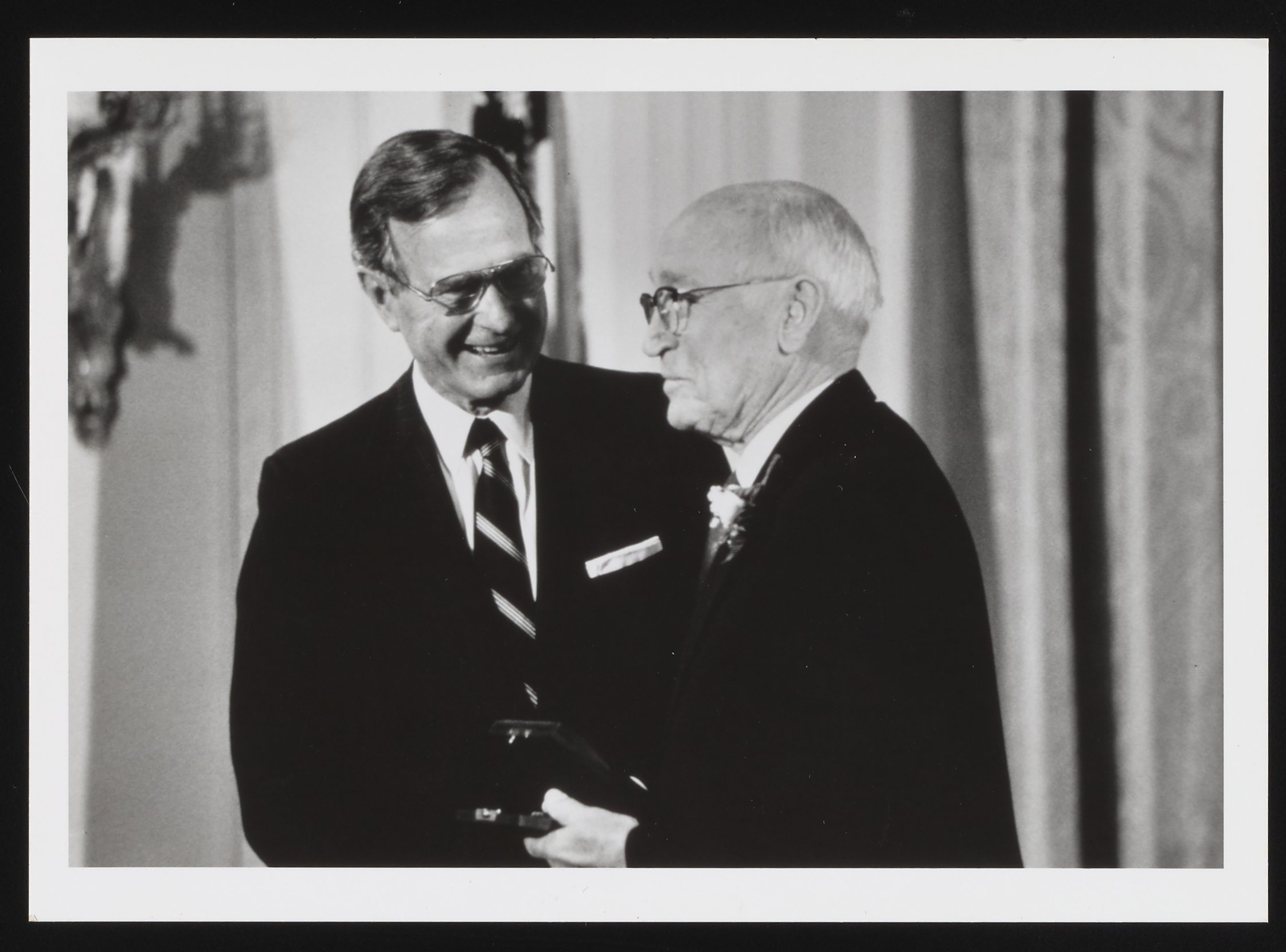 Valdez, D. “Arnold Beckman with George H. W. Bush,” October 18, 1989. Beckman Historical Collection, Box 57, Folder 1. Science History Institute. Philadelphia. https://digital.sciencehistory.org/works/8w32r621f.