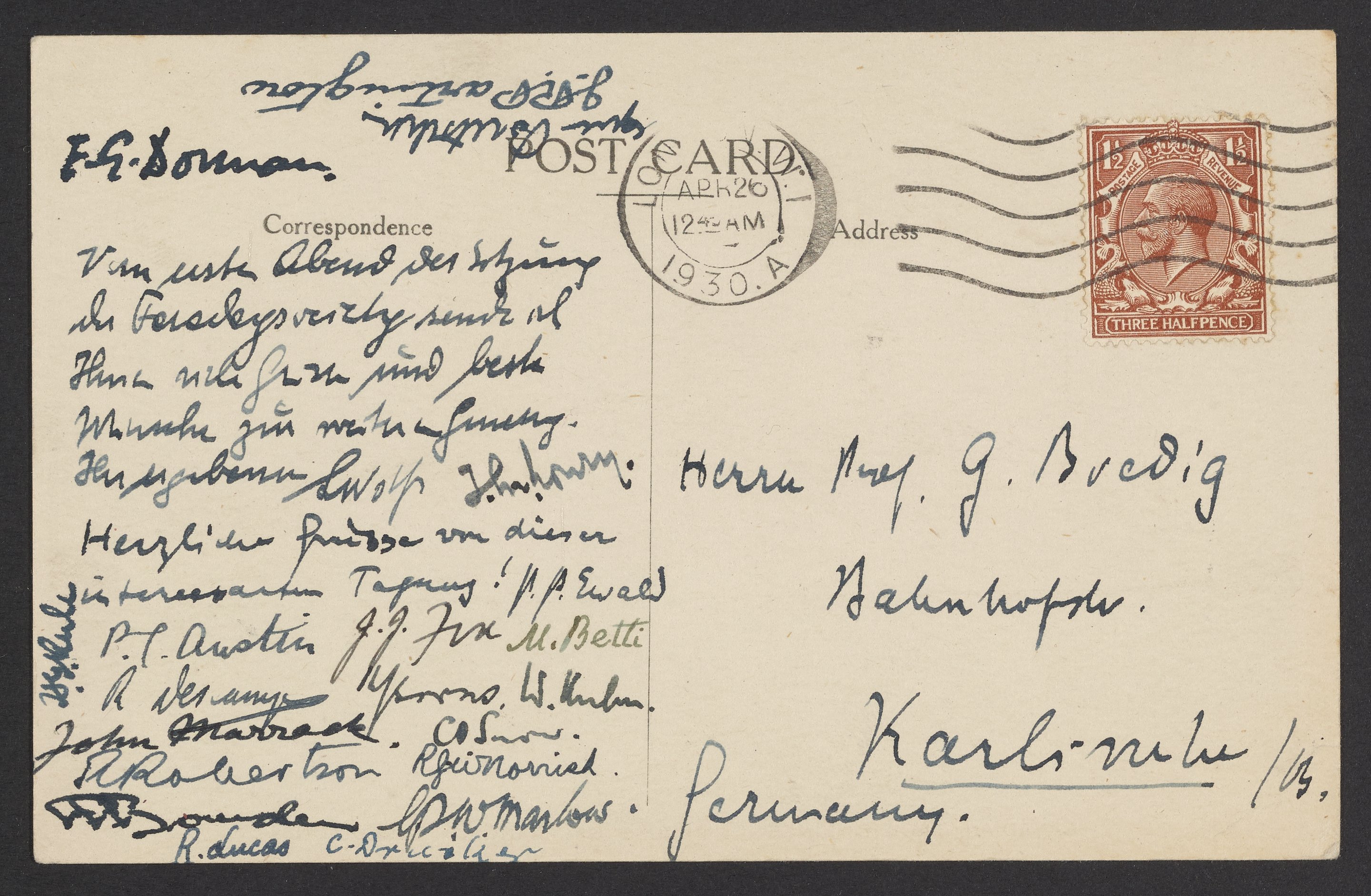 Small JPG1200 x 781px — 199 KBLarge JPG2880 x 1875px — 1.2 MBFull-sized JPG3489 x 2271px — 1.7 MBOriginal fileTIFF — 3489 x 2271px — 22.7 MBGeorg Bredig (1868-1944) receives a postcard from several colleagues who are attending a research conference in London in April 1930.