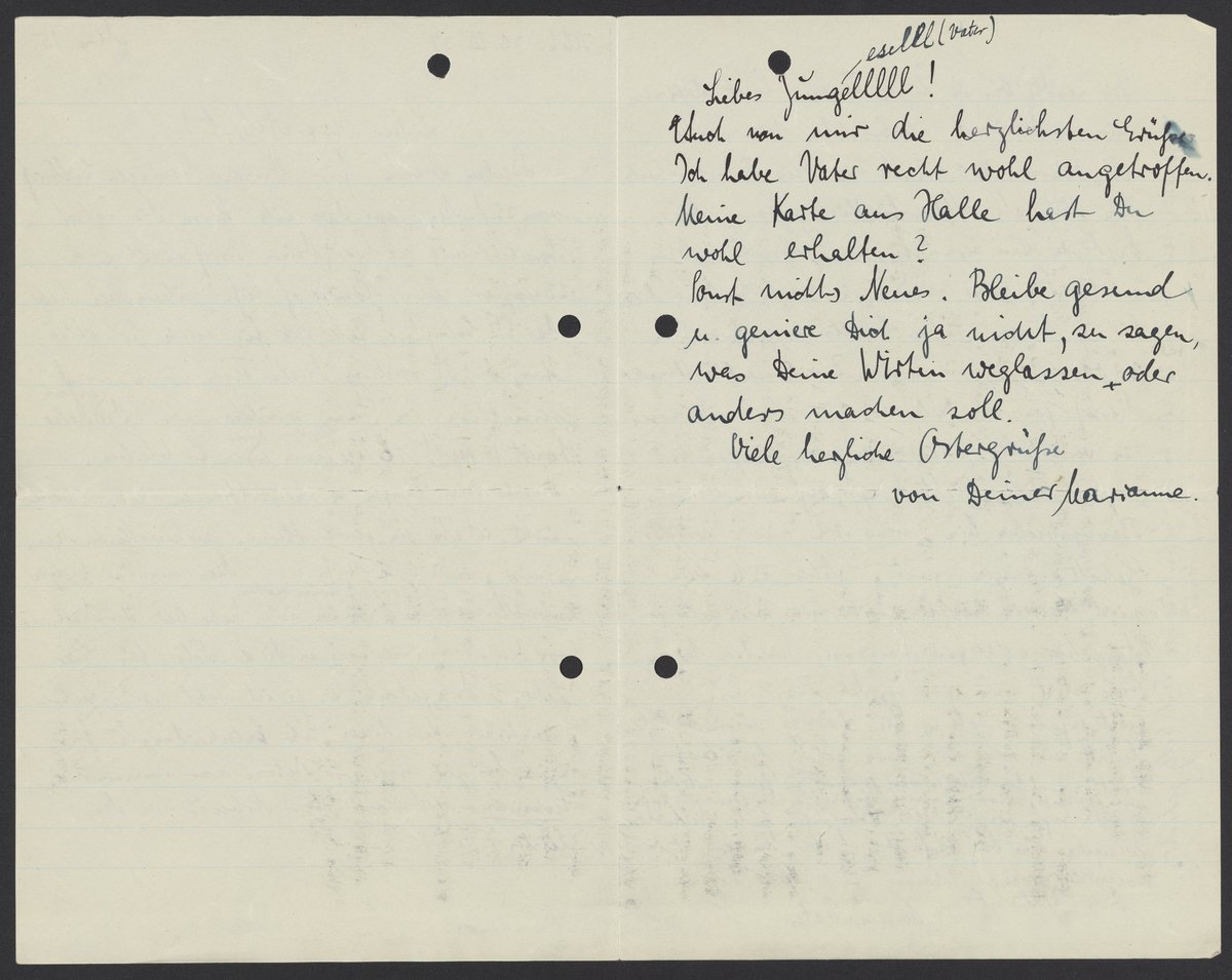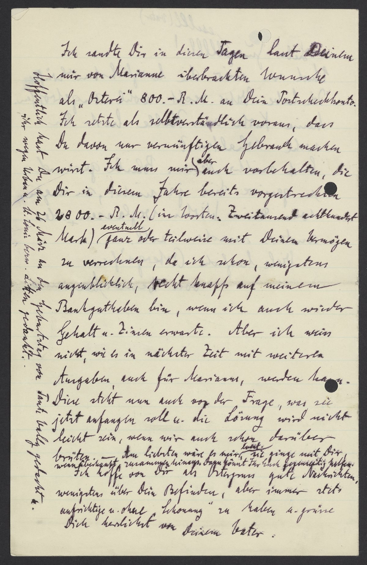 According to your wishes, as expressed to me by Marianne, I sent 800 Reichsmarks as “Osteria” to your checking account. I assume that you will spend it wisely. However, along with calculating your assets, I also must offset the 2,800 Reichsmarks (literally, two thousand eight hundred marks) that I already advanced to you this year. For the time being, my bank account balance is sparse, although I'm expecting my salary and interest again. Yet, regarding expenses, I don't know how things will turn out in the near future, especially for Marianne. What will she do now? The solution will not be easy, even if we are already contemplating it. I would prefer it if she went with you so that you can help each other.