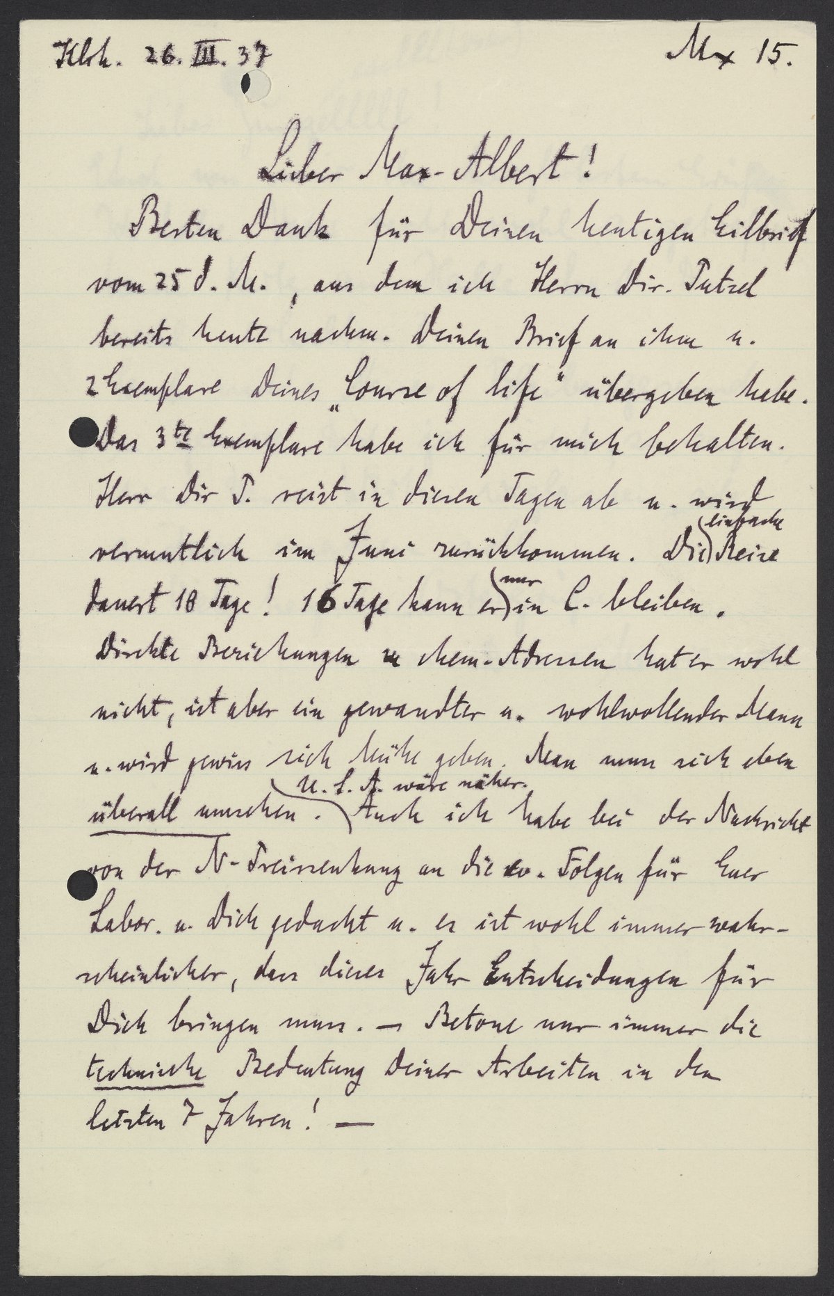 Besten Dank für Deinen heutigen Eilbrief vom 25 d.M., aus dem ich Herrn Dir. Putzel bereits heute nachm. Deinen Brief an ihn u. 2 Exemplare Deines “Course of life” übergeben habe. Das 3te Exemplare habe ich für mich behalten. Herr Dir. P. reist in diesen Tagen ab u. wird vermutlich im Juni zurückkommen. Die einfache Reise dauert 18 Tage! 16 Tage kann er nur in C. bleiben.