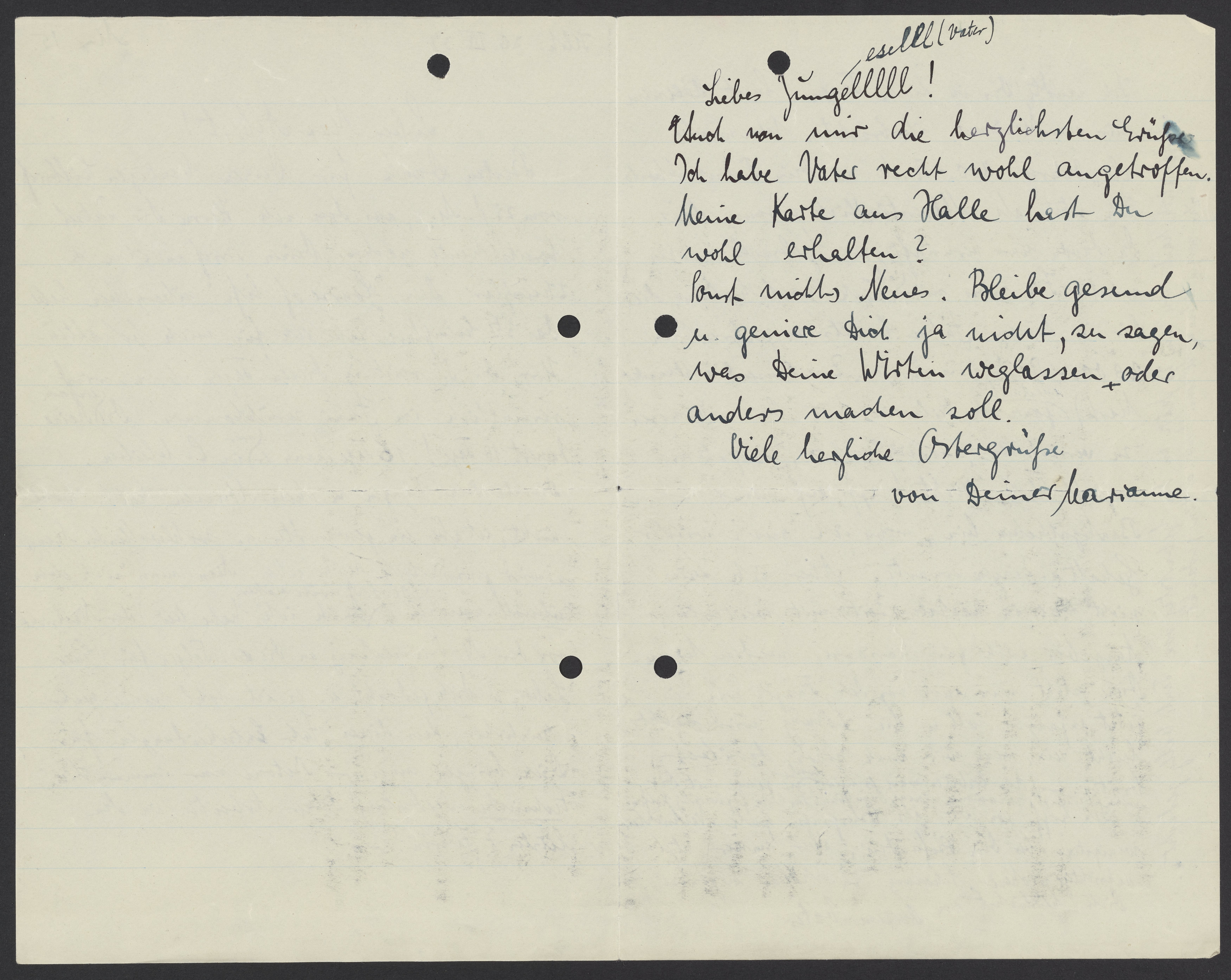 Ich hoffe von Dir als Ostergenuss gute Nachrichten, wenigstens über Dein Befinden, aber immer stets aufrichtige u. ohne Schönung zu haben u. grüsse Dich herzlichst von Deinem Vater.