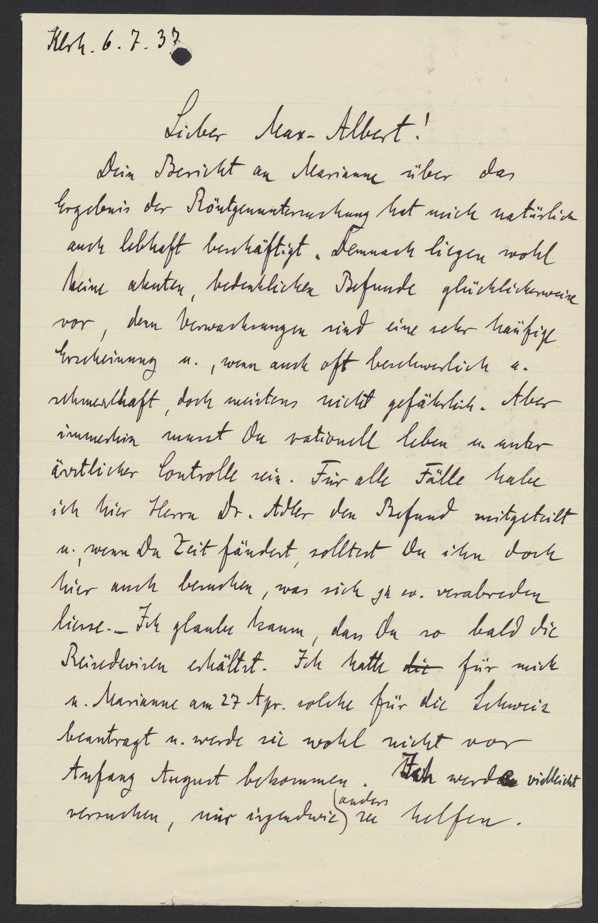 Dein Bericht an Marianne über das Ergebnis der Röntgenuntersuchung hat mich natürlich auch lebhaft beschäftigt. Demnach liegen wohl keine akuten, bedenklichen Befunde glücklicherweise vor, denn Verwandlungen sind eine sehr häufige Erscheinung u., wenn auch oft beschwerlich u. schmerzhaft, doch meistens nicht gefährlich. Aber immerhin musst Du rationell leben u. unter ärztlicher Controlle sein. Für alle Fälle habe ich hier Herrn Dr. Adler den Befund mitgeteilt u., wenn Du Zeit fändest, solltest Du ihn doch hier auch besuchen, was sich ja ev. verabreden liesse. Ich glaube kaum, dass Du so bald die Reisedevisen erhältst. Ich hatte für mich u. Marianne am 27 Apr. solche für die Schweiz beantragt u. werde sie wohl nicht vor August bekommen. Ich werde vielleicht versuchen, mir irgendwie anders zu helfen.