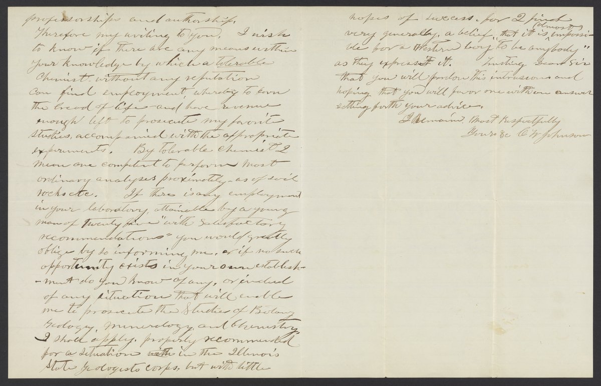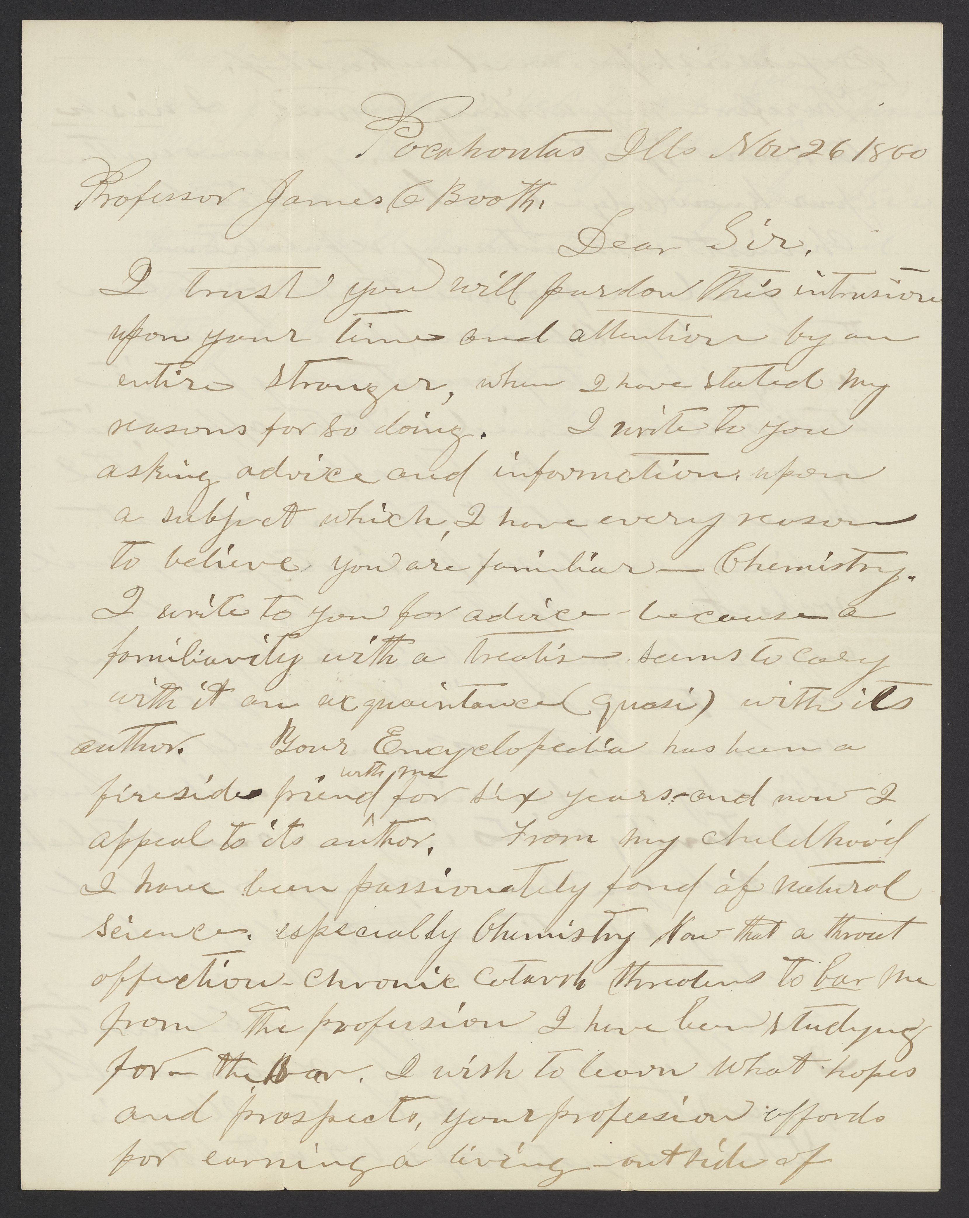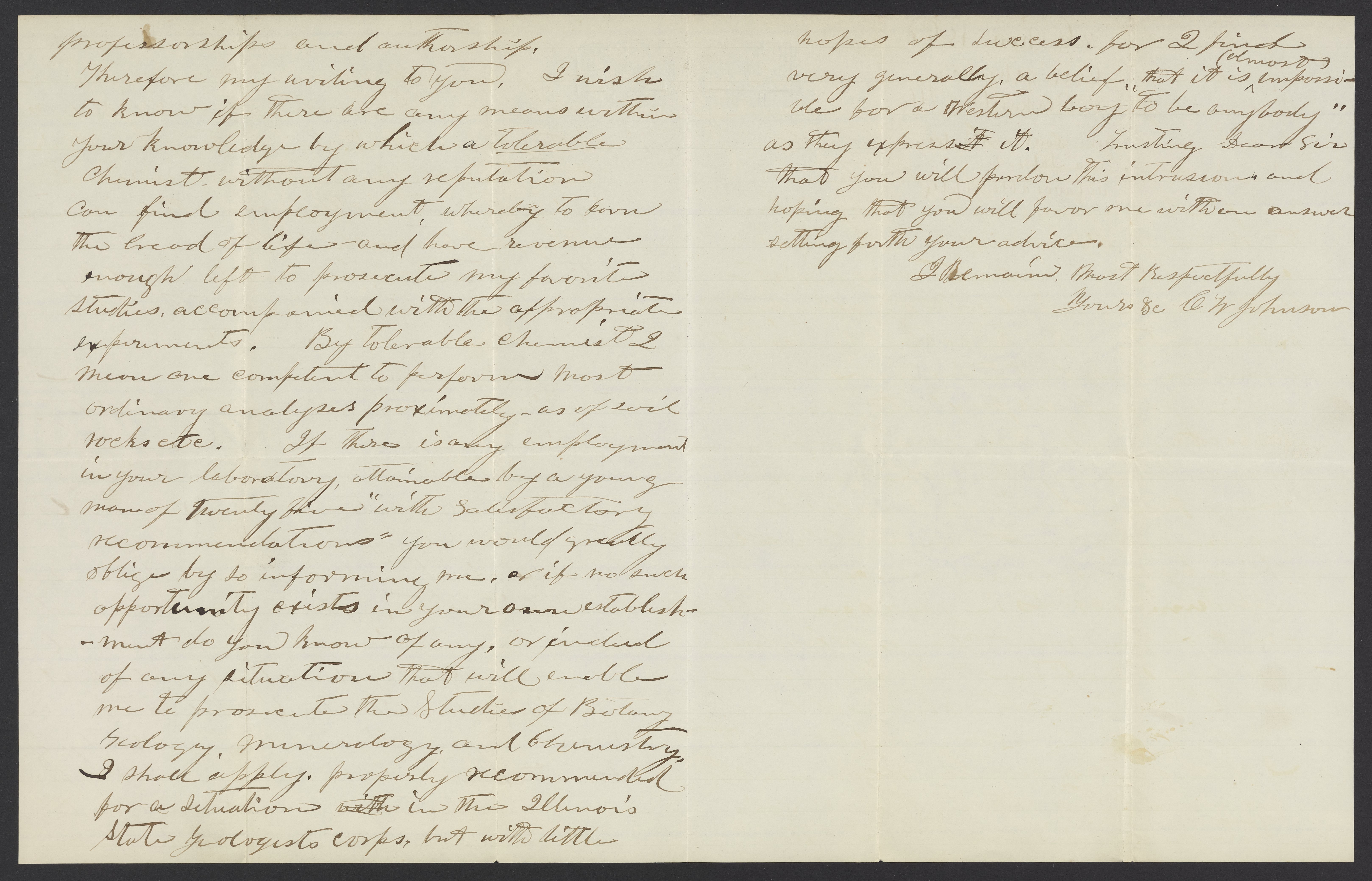 Small JPG1200 x 1508px — 254 KBLarge JPG2880 x 3620px — 1.1 MBFull-sized JPG3318 x 4170px — 1.4 MBOriginal fileTIFF — 3318 x 4170px — 39.6 MBC. W. Johnson, seeking employment, writes to James Curtis Booth (1810-1888) to see if there is any "employment in your laboratory attainable by a young man of twenty-five 'with satisfactory recommendation'."