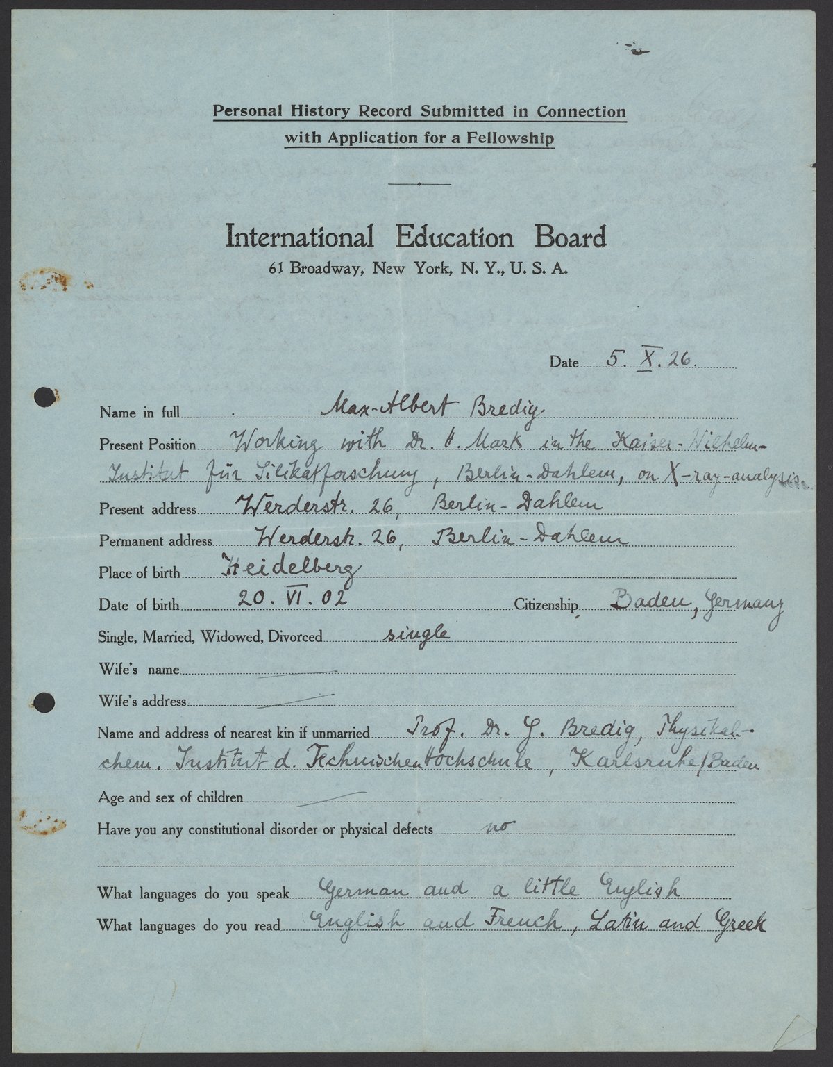 Application for a fellowship by Max Bredig