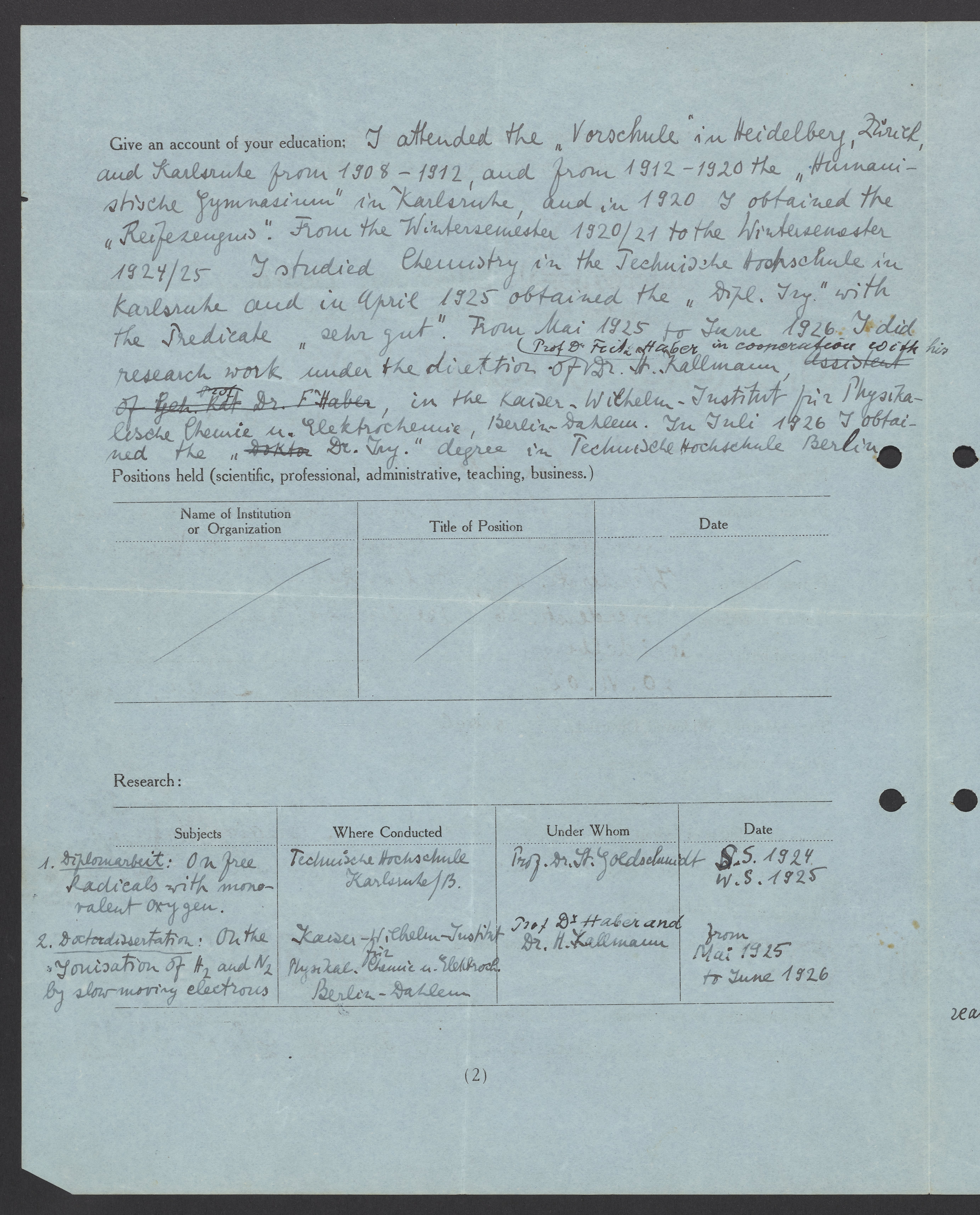 Application for a fellowship by Max Bredig