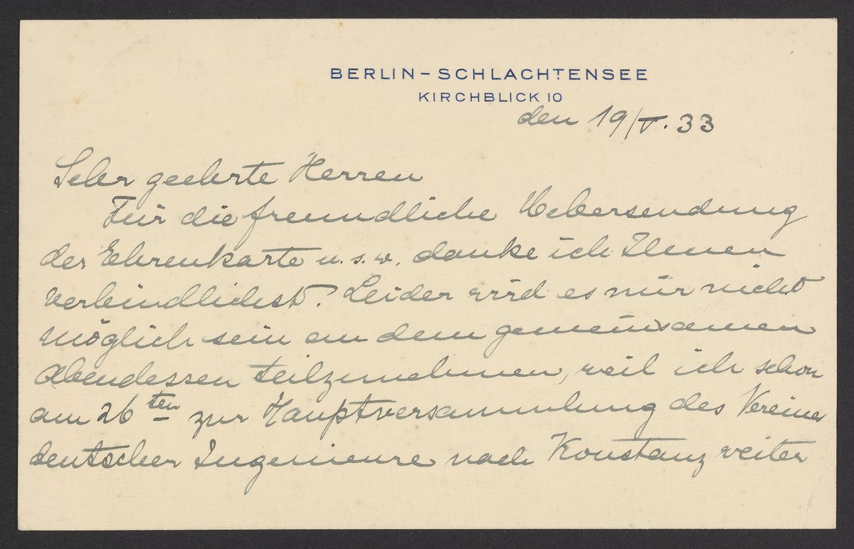 Für die freundliche Uebersendung der Ehrenkarte u.s.w. danke ich Ihnen verbindlichst. Leider wird es mir nicht möglich an dem gemeinsamen Abendessen teilzunehmen, weil ich schon am 26ten zur Hauptversammlung des Vereines der deutschen Ingenieure nach Konstanz weiter