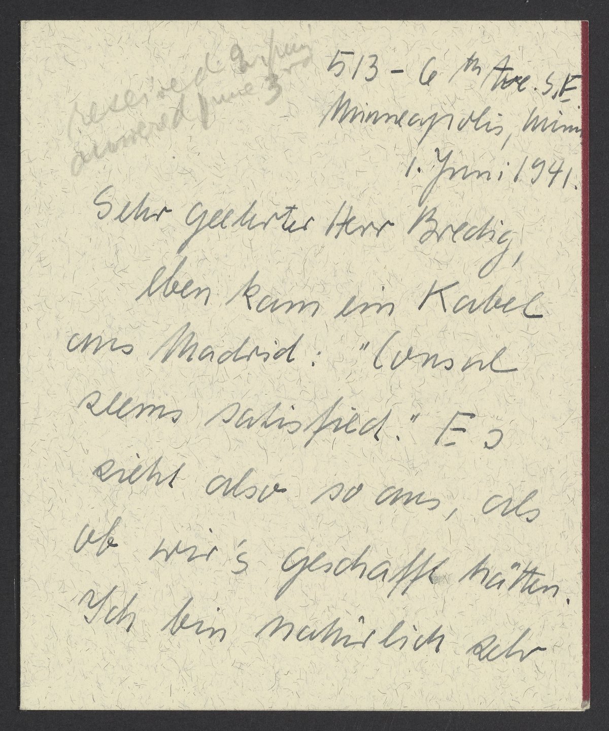 Wolfsberg, Ilse. “Letter from Ilse Wolfsberg to Max Bredig, June 1, 1941,” June 1, 1941. Papers of Georg and Max Bredig, Box 9, Folder 25. Science History Institute. Philadelphia. https://digital.sciencehistory.org/works/920x2yk.