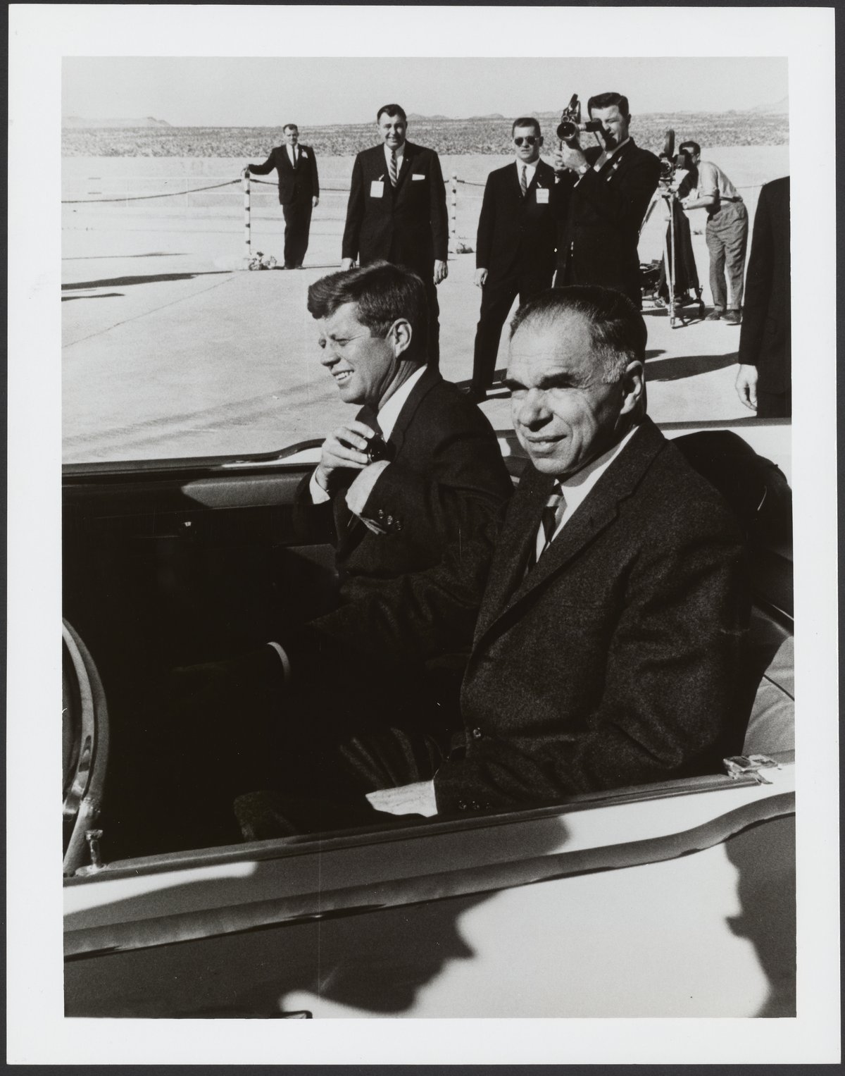 Small JPG1200 x 1527px — 205 KBLarge JPG2880 x 3664px — 1014 KBFull-sized JPG5380 x 6844px — 3.1 MBOriginal fileTIFF — 5380 x 6844px — 105 MBBlack and white photograph of President John F. Kennedy (1917-1963) and Glenn T. Seaborg (1912-199) seated in the backseat of a top-down convertible car during a Presidential Tour of Nuclear Rocket Development at the Nevada Test Site (NTS). First known as the Nevada Proving Grounds, the NTS was established for the testing of nuclear devices.