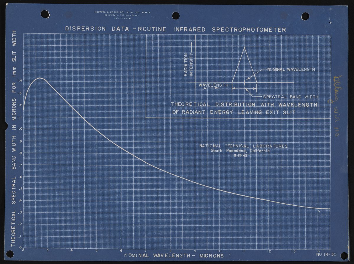 Beckman Instruments, Inc. “Dispersion Data for Routine Infrared Spectrophotometer,” September 17, 1942. Beckman Historical Collection, Box 18, Folder 9. Science History Institute. Philadelphia. https://digital.sciencehistory.org/works/9306sz313.