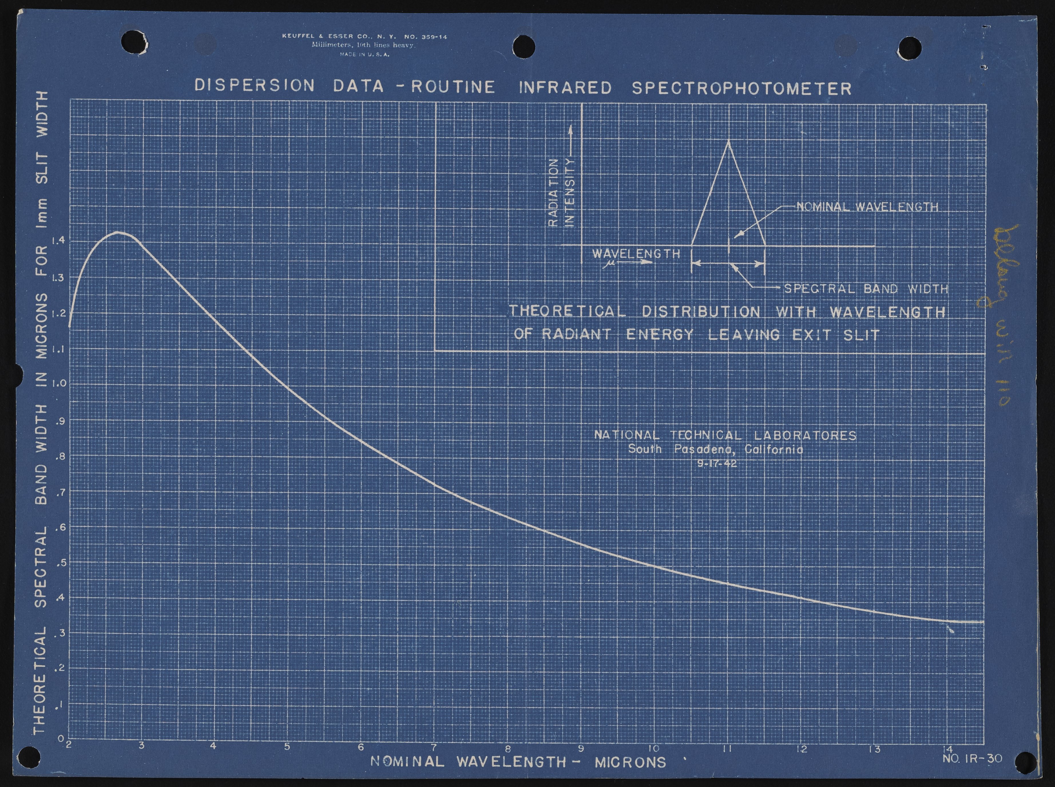 Beckman Instruments, Inc. “Dispersion Data for Routine Infrared Spectrophotometer,” September 17, 1942. Beckman Historical Collection, Box 18, Folder 9. Science History Institute. Philadelphia. https://digital.sciencehistory.org/works/9306sz313.