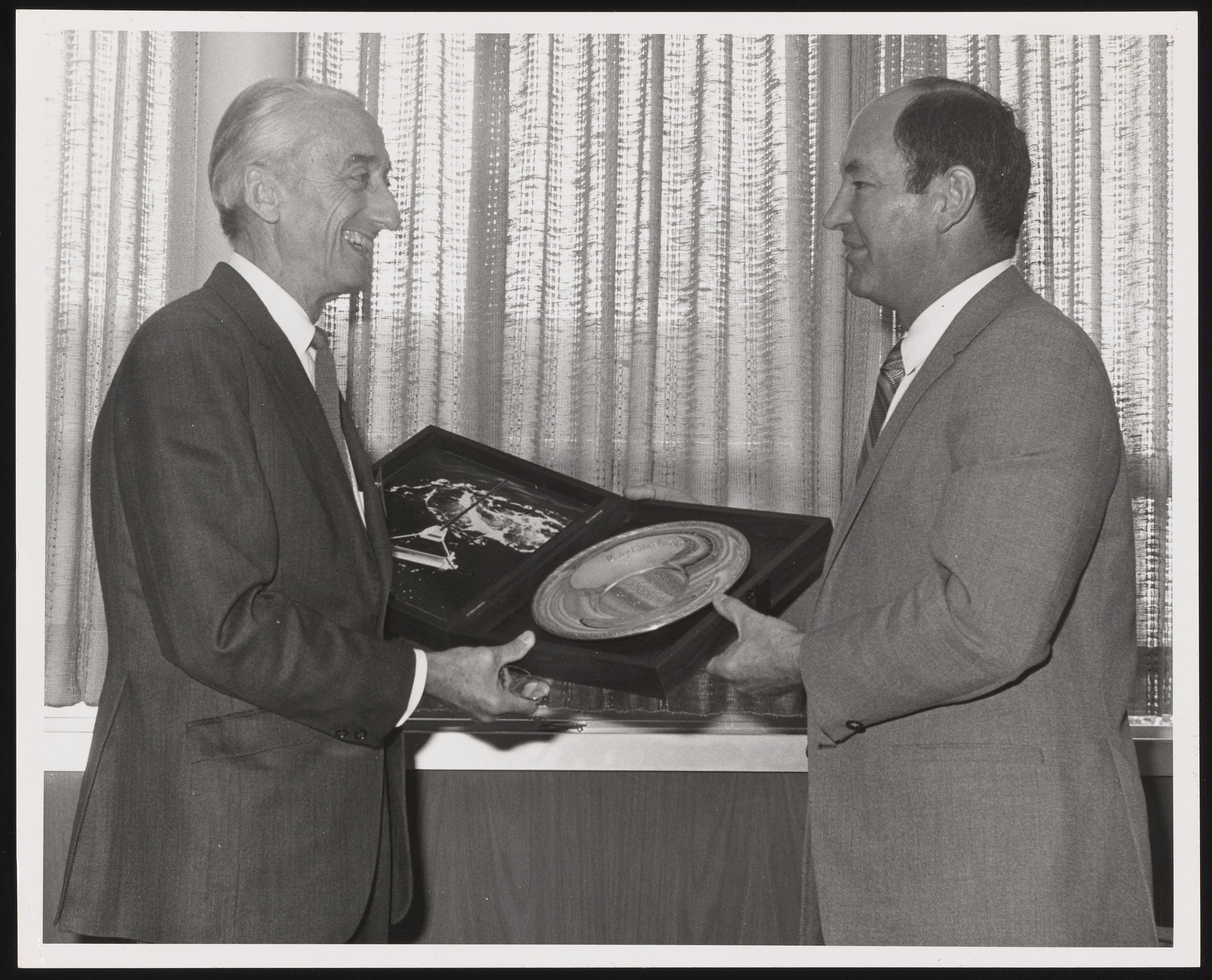Black and white photograph of Dr. William F. Ballhaus, Sr. (1918-2013) receiving an award from Jacques Cousteau (1910-1997).