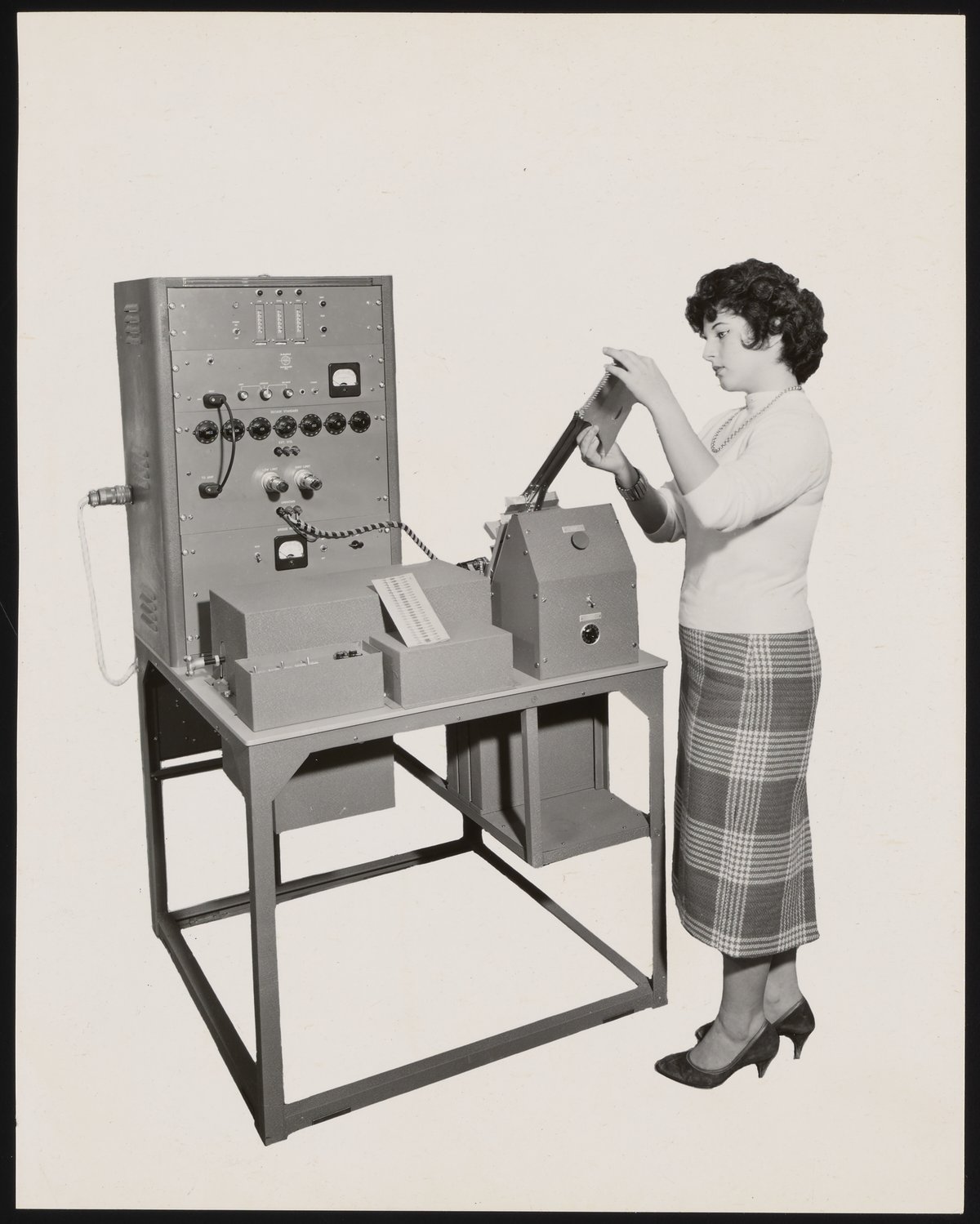“Woman Using a Beckman Model AB-4-5 Sorting Bridge,” n.d. Beckman Historical Collection, Box 79. Science History Institute. Philadelphia. https://digital.sciencehistory.org/works/9306sz445.