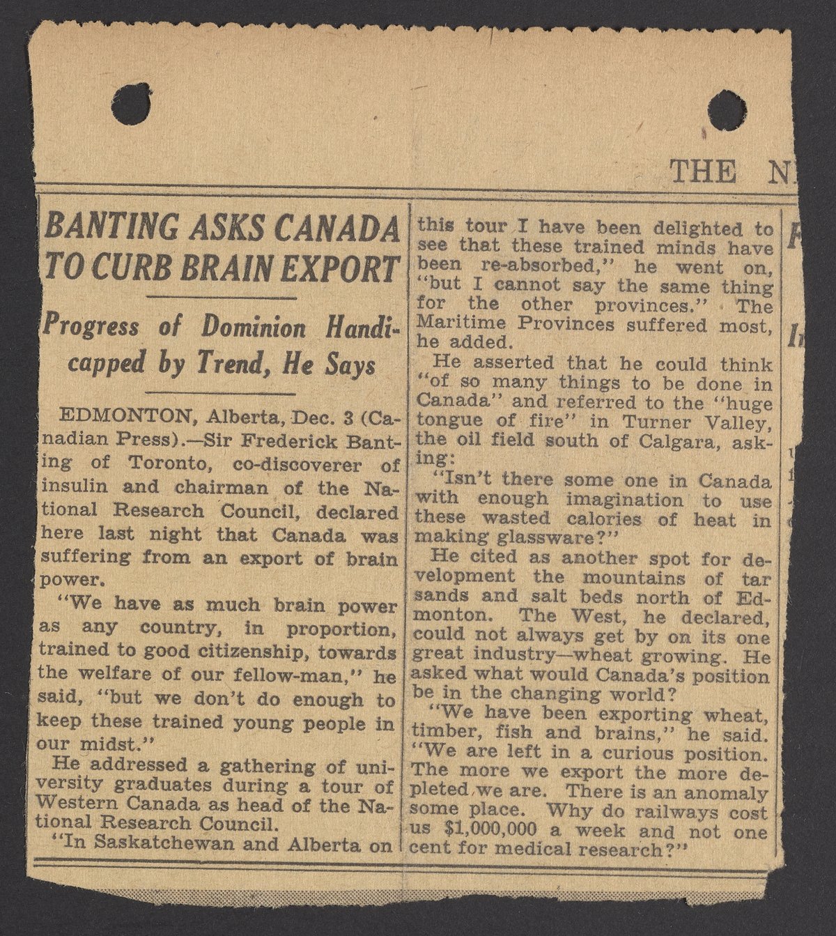 “Banting Asks Canada to Curb Brain Export.” New York times, 1938. Papers of Georg and Max Bredig, Box 10, Folder 23. Science History Institute. Philadelphia. https://digital.sciencehistory.org/works/93b4xmn.