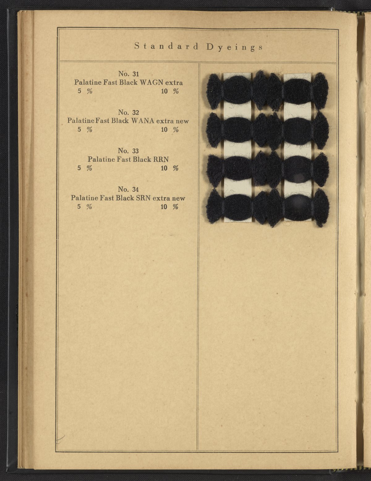 Small JPG1200 x 1564px — 285 KBLarge JPG2880 x 3754px — 1.7 MBFull-sized JPG4055 x 5285px — 3.3 MBOriginal fileTIFF — 4055 x 5285px — 61.3 MBSample book for Palatine fast dyes, a trade name for metal-complex dyes where chromium is incorporated into the dyestuffs molecule by the manufacturer. The process for Palatine fast dyes was achieved around 1915 by I.G. Farben Industries AG, and the dyes were widely used for wool in "suitings and better dress goods," as well as "knitting, weaving, and carpet yarns." The text describes the dyeing process and contains mounted yarn samples with dye concentrations and information on color fastness to various effects, such as washing, milling, and perspiration.