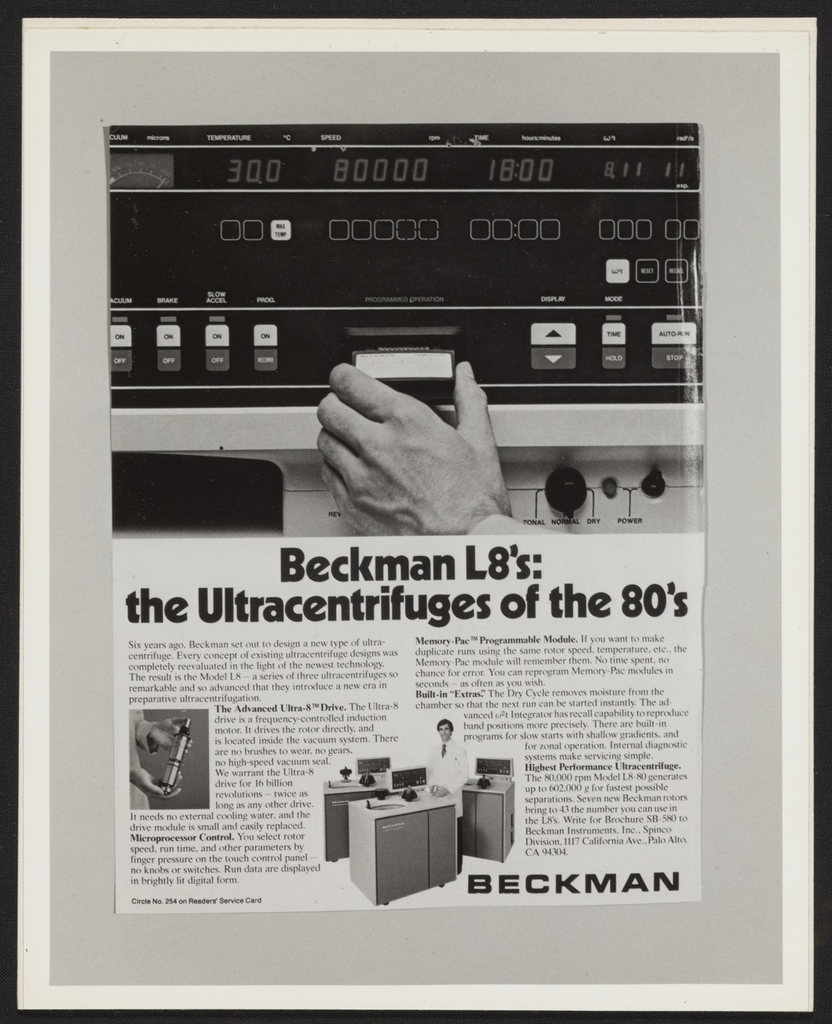 Beckman Instruments, Inc. “Beckman L8's: the Ultracentrifuges of the 80's,” 1980–1989. Beckman Historical Collection, Box 55, Folder 137. Science History Institute. Philadelphia. https://digital.sciencehistory.org/works/9593tv18r.