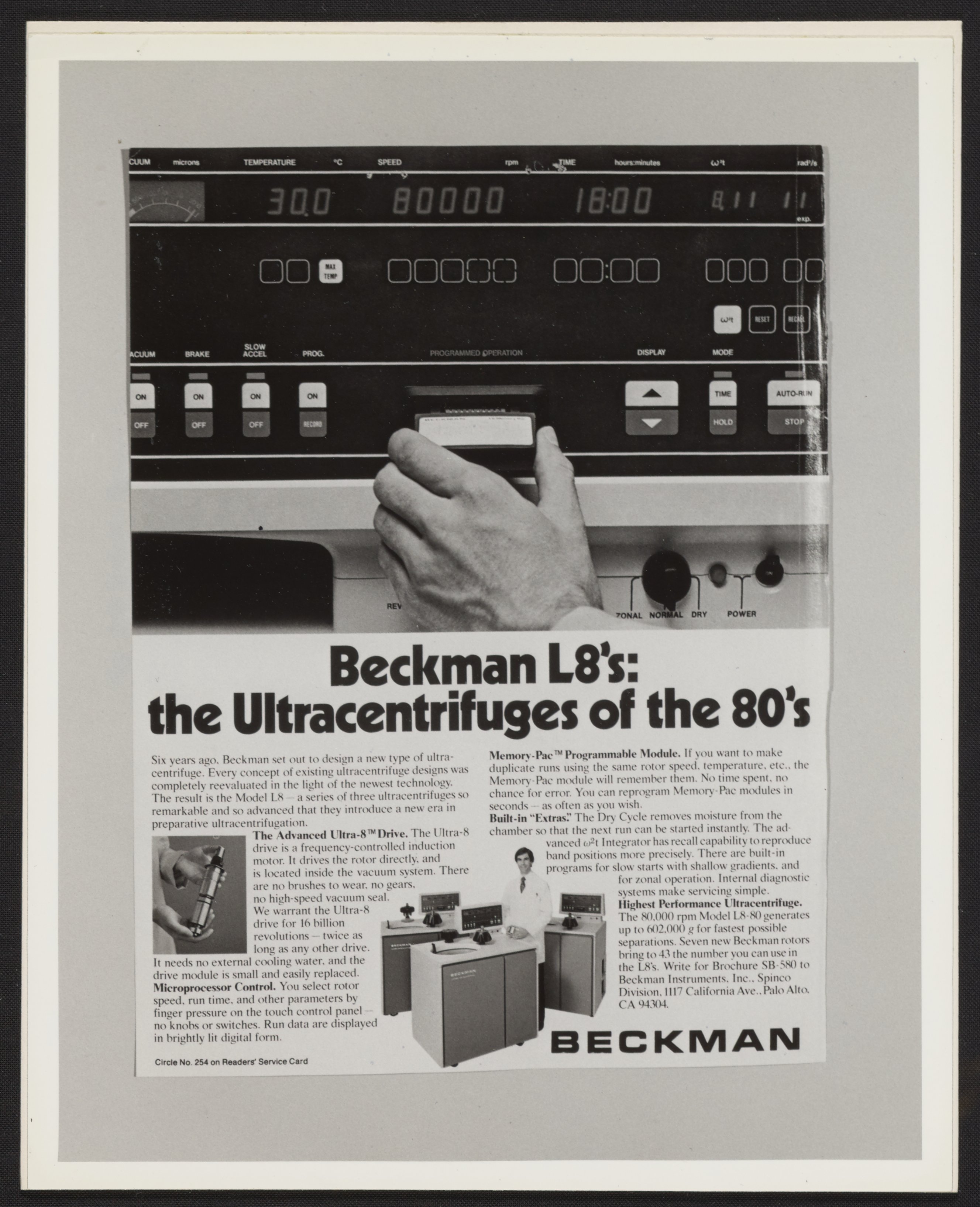 Beckman Instruments, Inc. “Beckman L8's: the Ultracentrifuges of the 80's,” 1980–1989. Beckman Historical Collection, Box 55, Folder 137. Science History Institute. Philadelphia. https://digital.sciencehistory.org/works/9593tv18r.