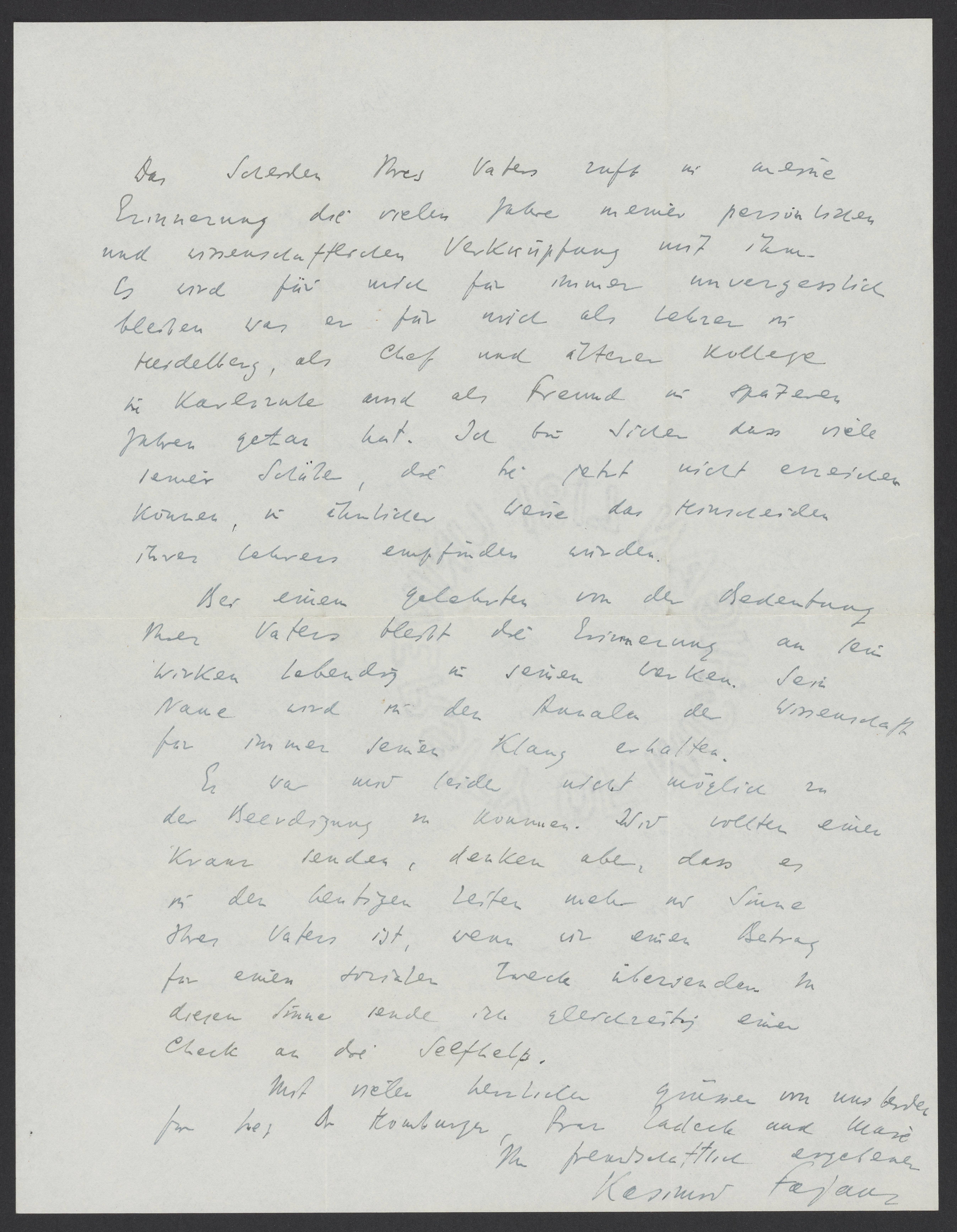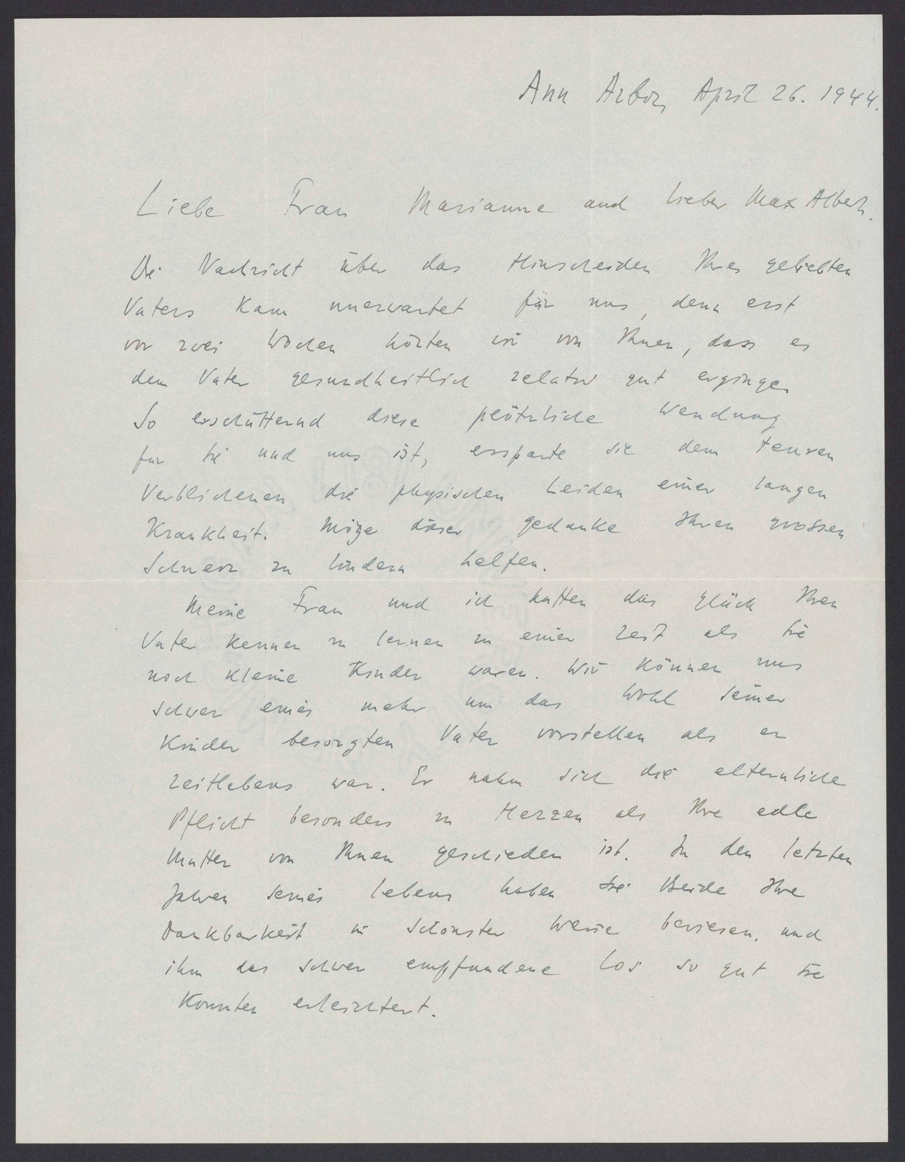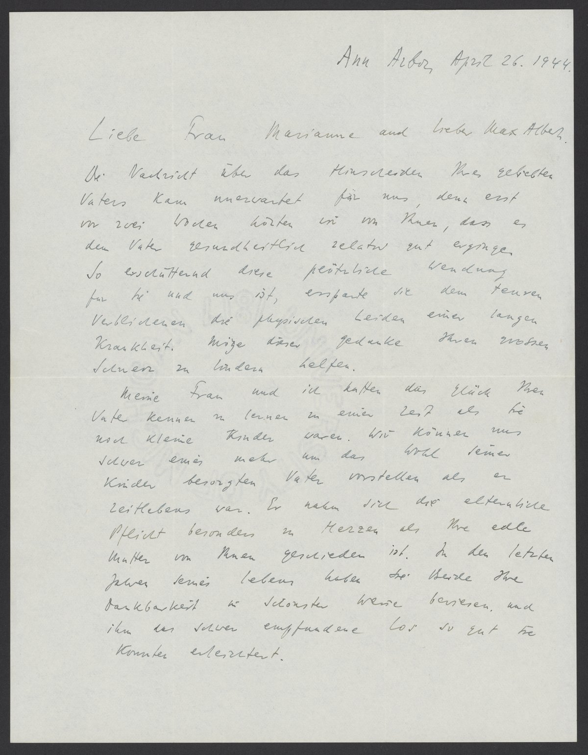 Letter from Kasimir Fajans to Marianne and Max Bredig, April 1944