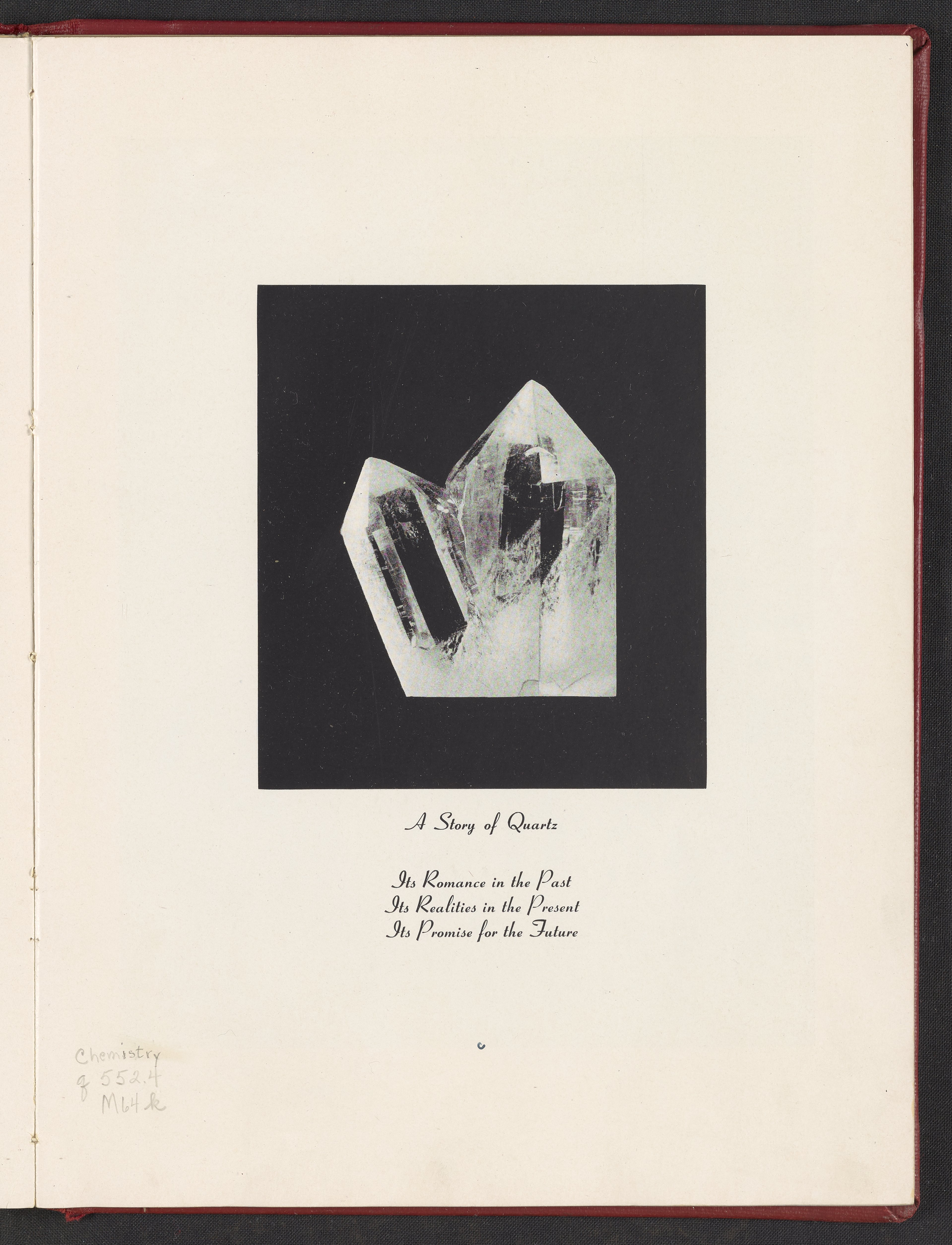 Small JPG1200 x 1558px — 233 KBLarge JPG2880 x 3738px — 1.1 MBFull-sized JPG4107 x 5331px — 1.9 MBOriginal fileTIFF — 4107 x 5331px — 62.7 MBIllustrated publication or brochure discussing the mineral, Quartz. Divided into three sections: "Its Romance in the Past", "Its Realities in the Present", and "Its Promise for the Future", the publication describes the discovery, mining, historical, scientific, and industrial uses, and the future of Quartz. Contains fifty black and white photographic reproductions and ten printed color illustrations. The publication is digitized in its entirety.