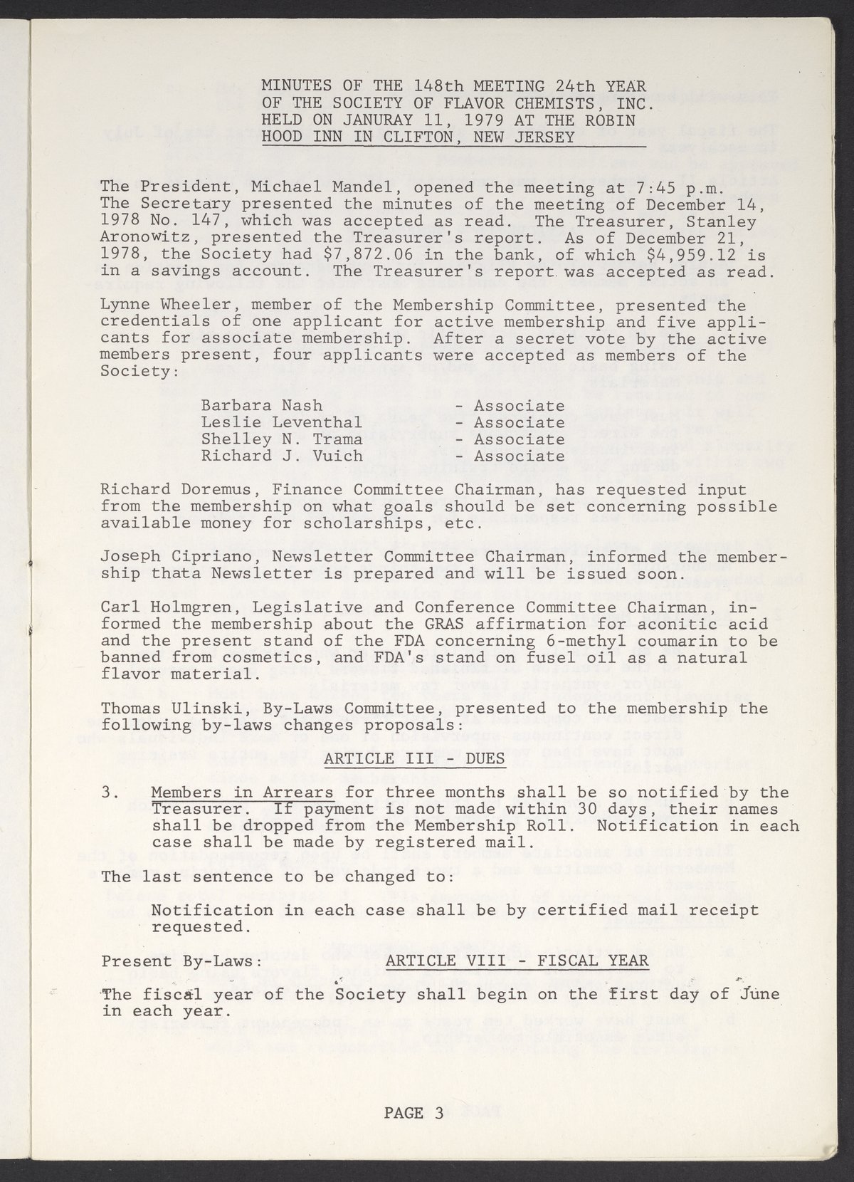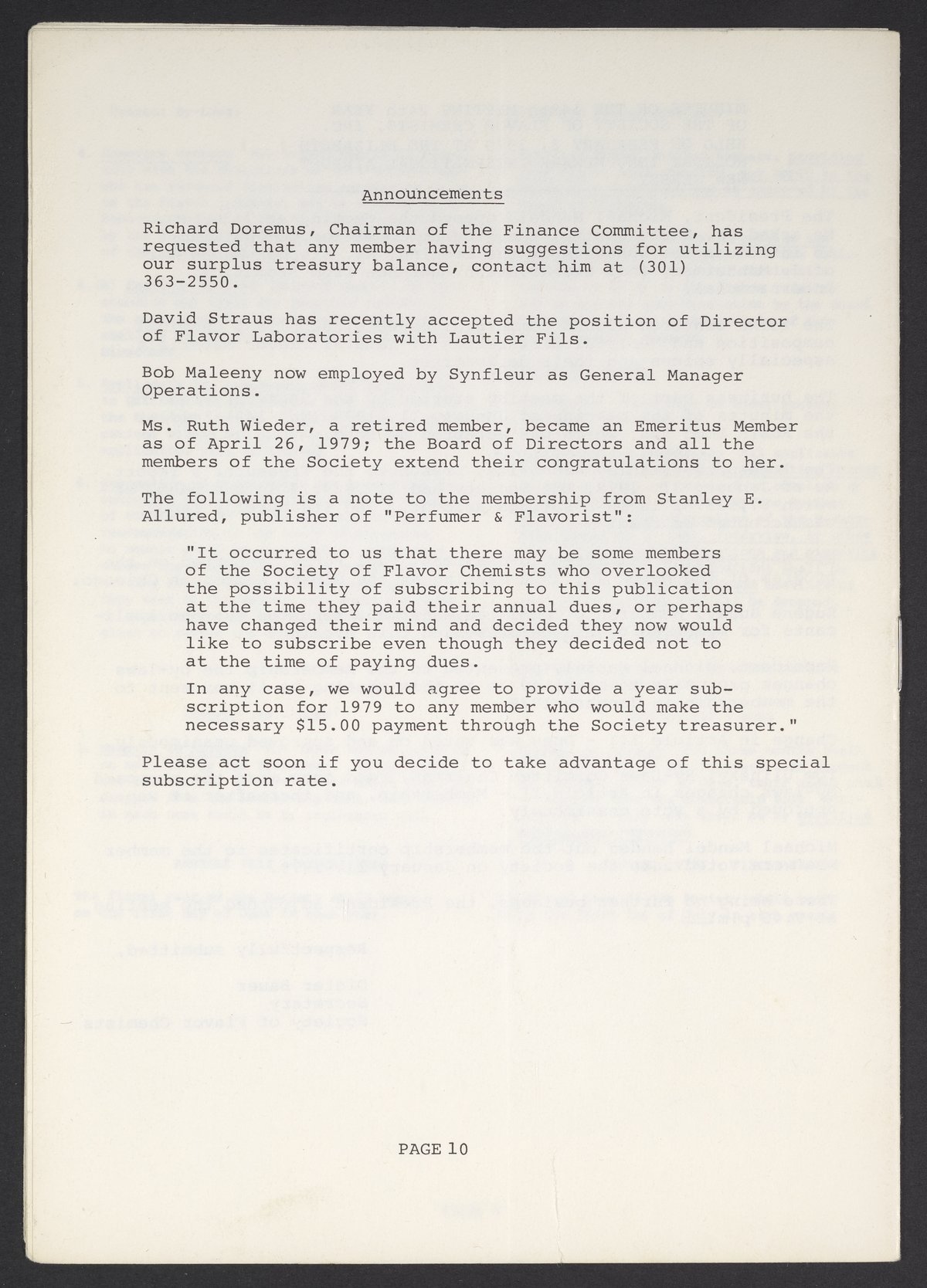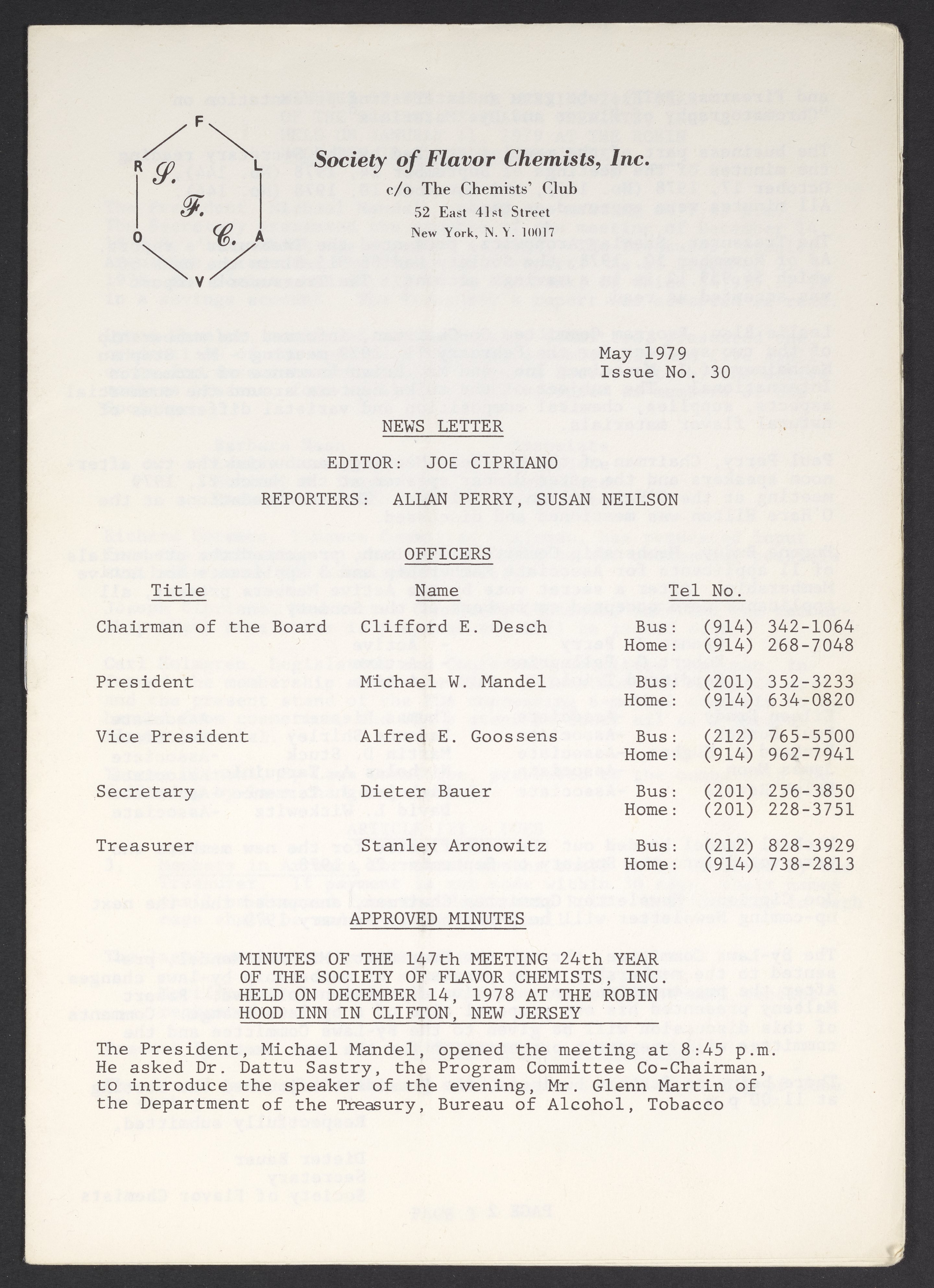 Society of Flavor Chemists. “Society of Flavor Chemists Newsletter, May 1979,” May 1979. Society of Flavor Chemists Newsletters and Certificate of Incorporation, Box 1, Folder 1. Science History Institute. Philadelphia. https://digital.sciencehistory.org/works/97jbpxs.