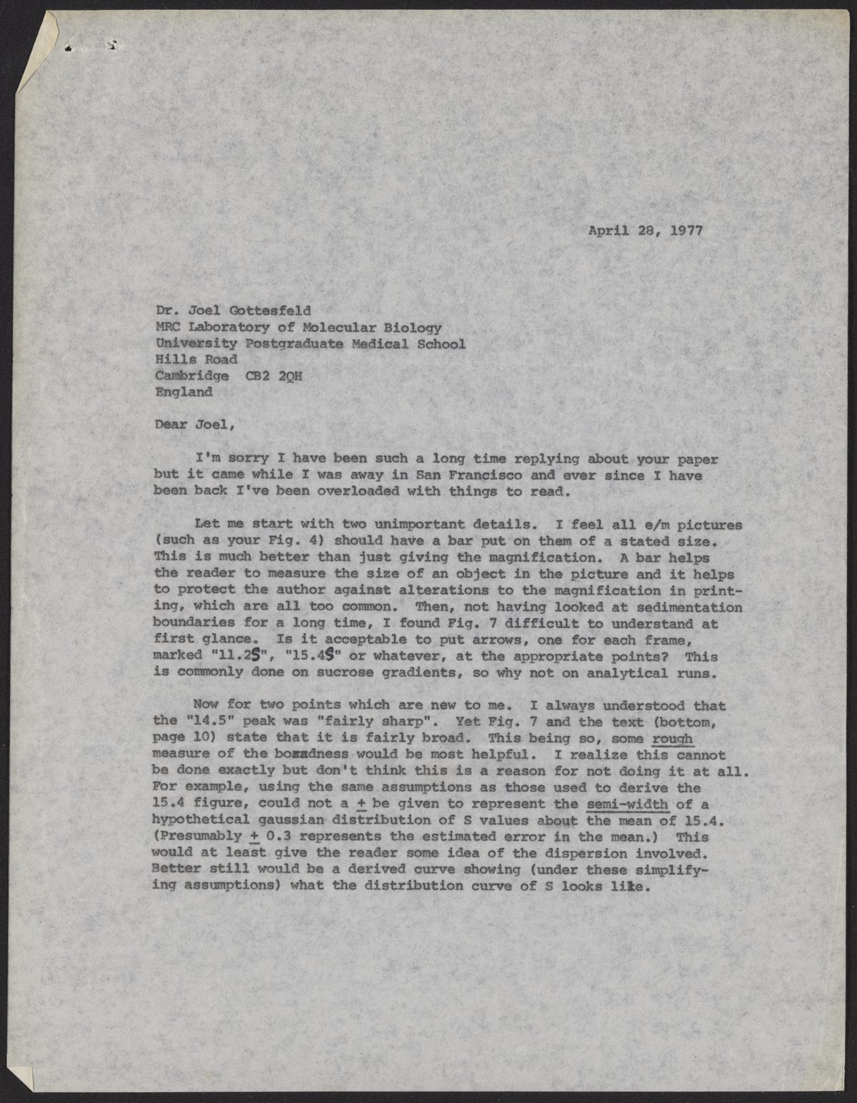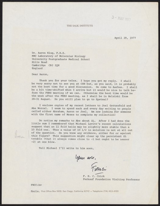 Crick, Francis. “Letter from Francis Crick to Aaron Klug, April 29, 1977,” April 29, 1977. History of Molecular Biology Collection, Box 20, Folder 1. Science History Institute. Philadelphia. https://digital.sciencehistory.org/works/97qhm3e.