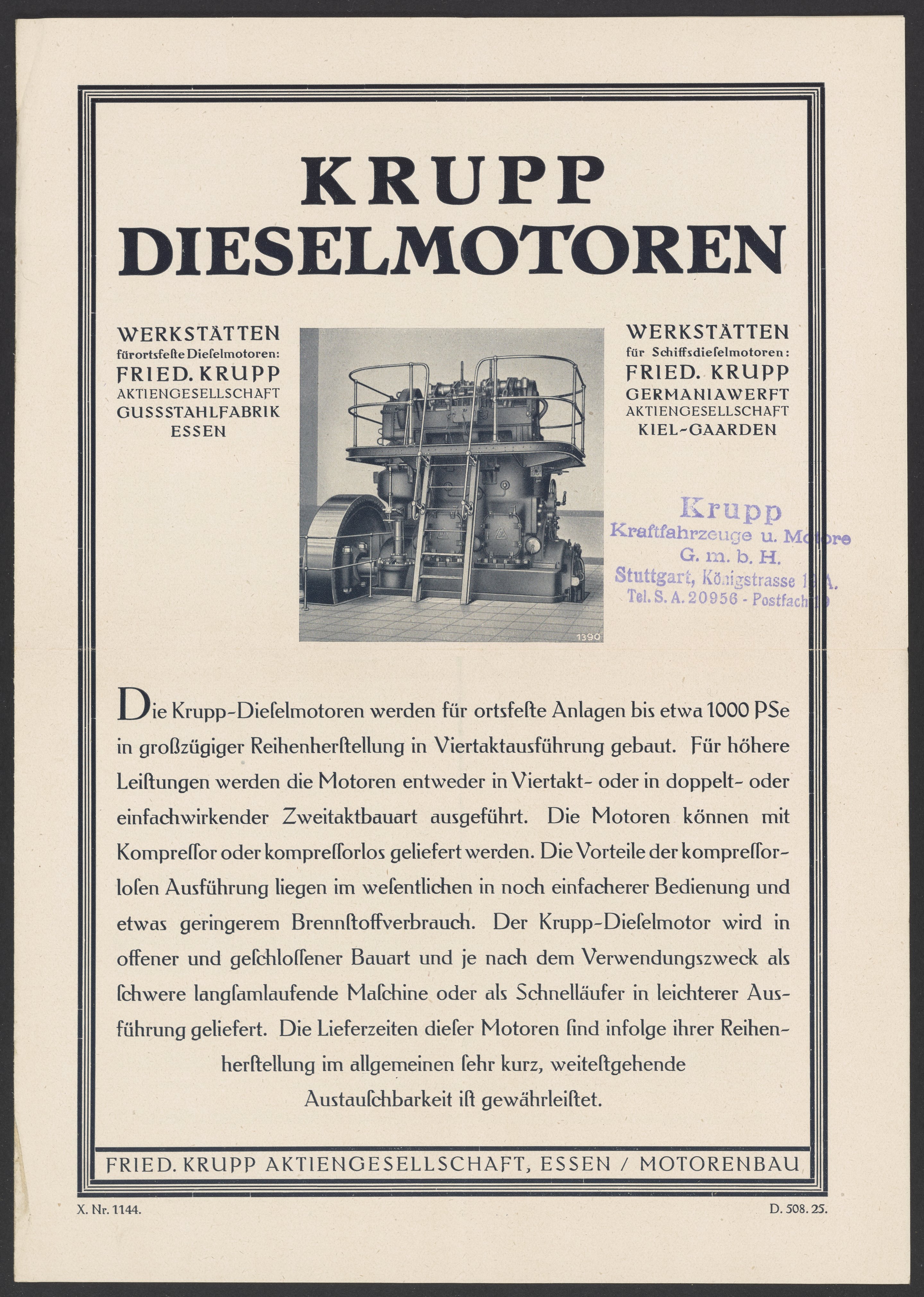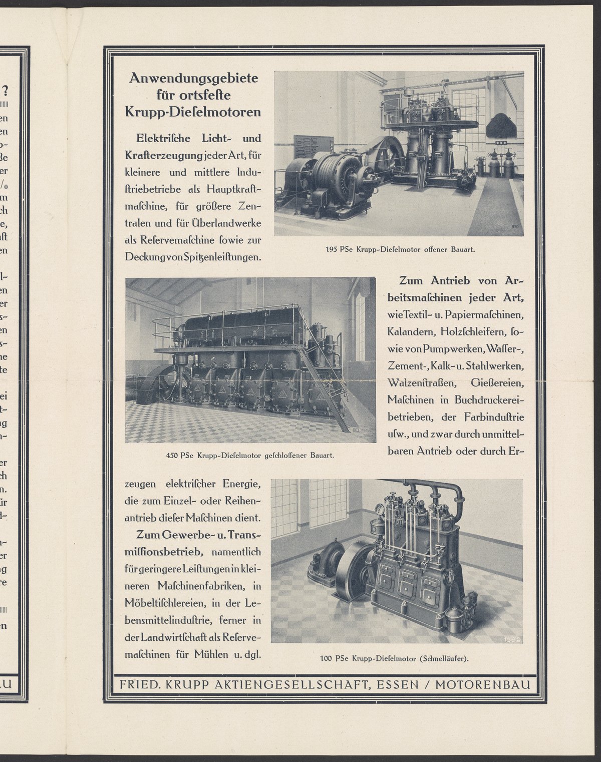 Fried. Krupp AG. “Krupp Dieselmotoren,” circa 1925. Papers of Georg and Max Bredig, Box 3, Folder 3. Science History Institute. Philadelphia. https://digital.sciencehistory.org/works/982u1pf.