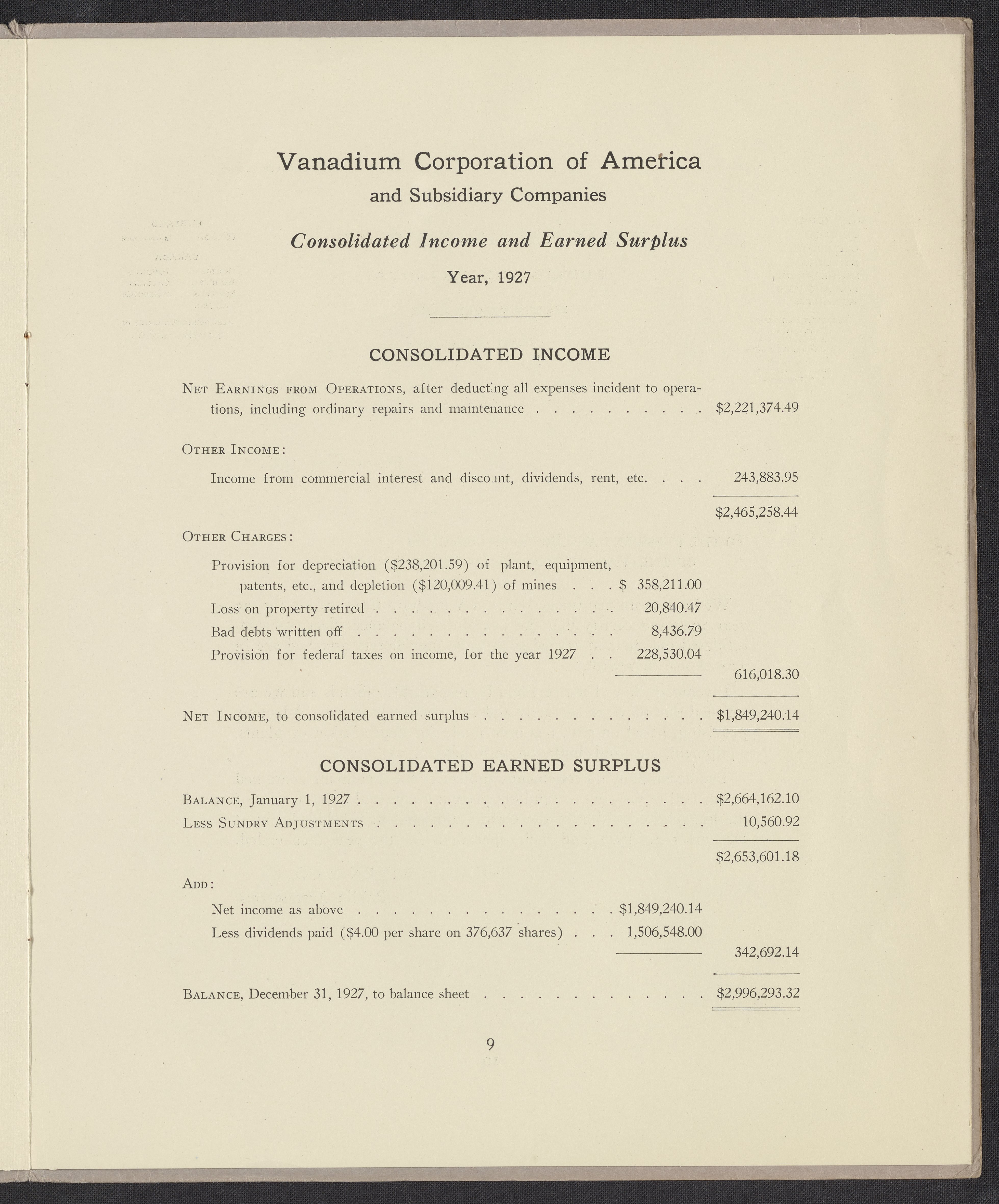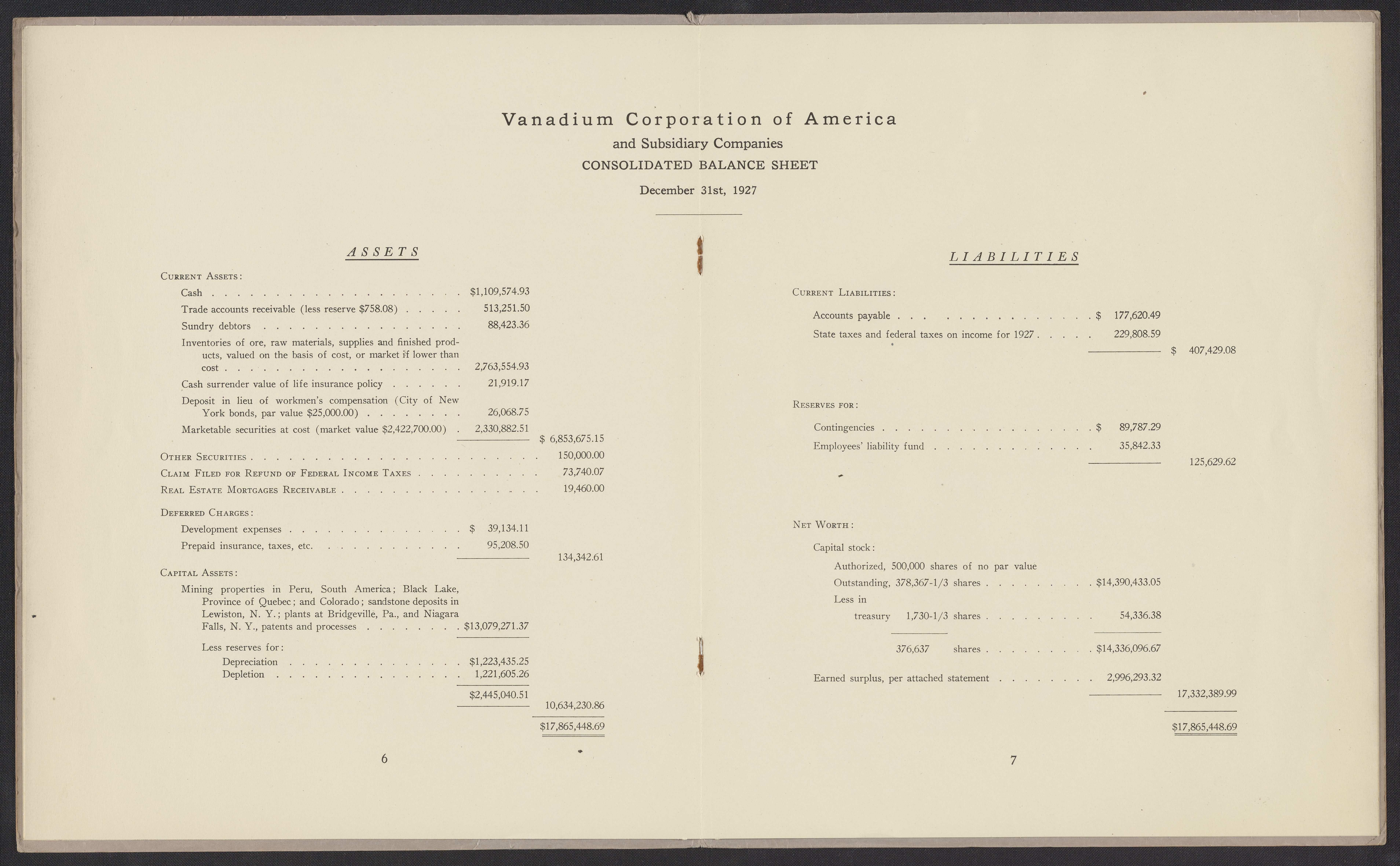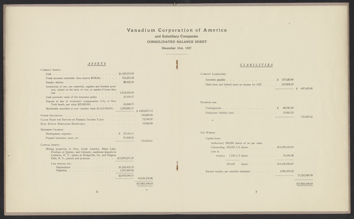 Small JPG1200 x 1453px — 183 KBLarge JPG2880 x 3487px — 1.3 MBFull-sized JPG3874 x 4690px — 2.4 MBOriginal fileTIFF — 3874 x 4690px — 52.0 MBAnnual report including the list of directors, executive committee, finance committee and officers of the Vanadium Corporation of America, as well as the "Eighth Annual Report to Stockholders of Vanadium Corporation of America." The "Consolidated Balance Sheet" dated December 31, 1927 and "Consolidated Income and Earned Surplus" for the year 1927, both for the Vanadium Corporation of America and Subsidiary Companies, are also included. The last page consists of a letter to the president and board of directors of the Vanadium Corporation of America from the public accountants of Touche, Niven & Company vouching for the credibility of the financial statements contained therein.