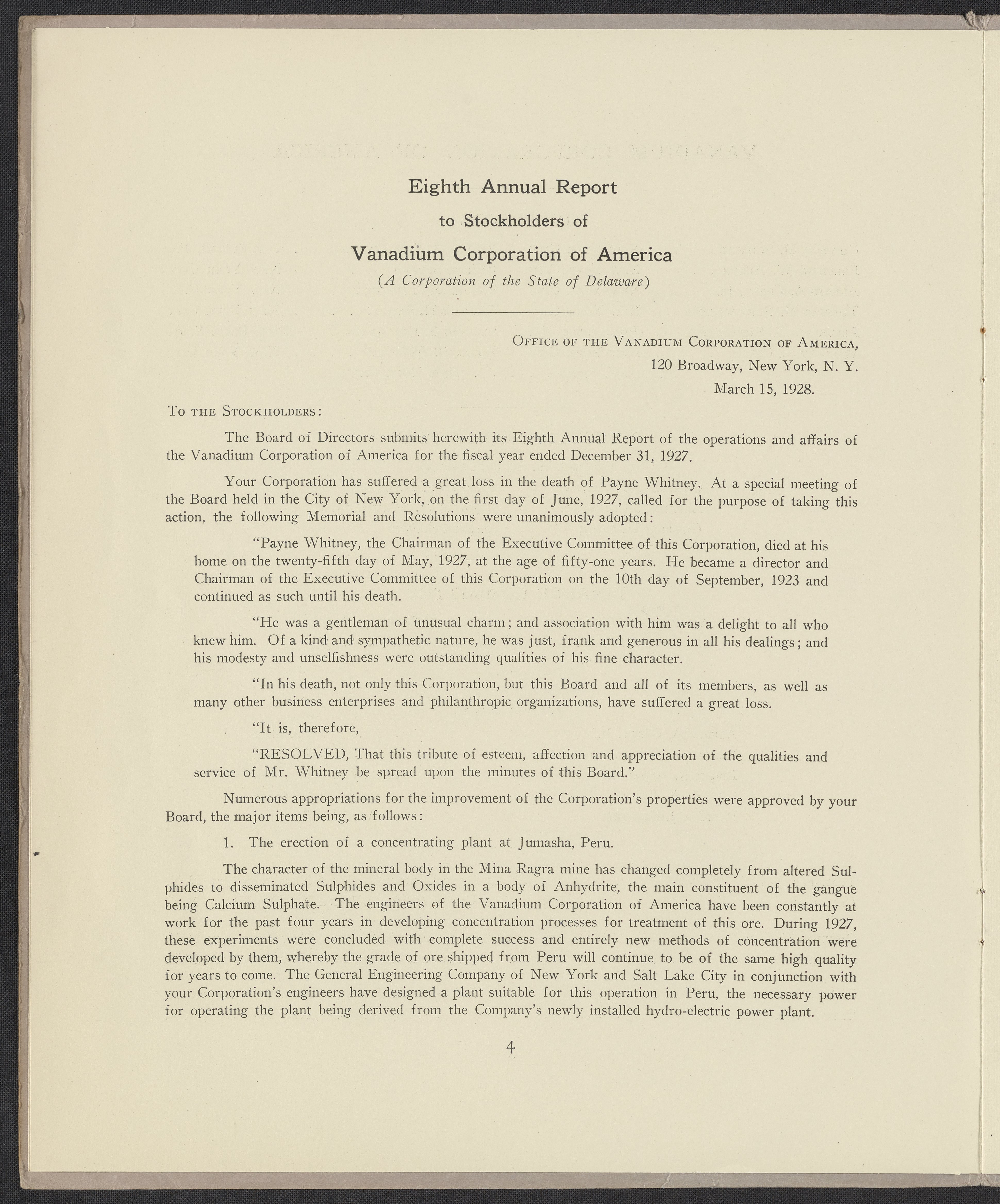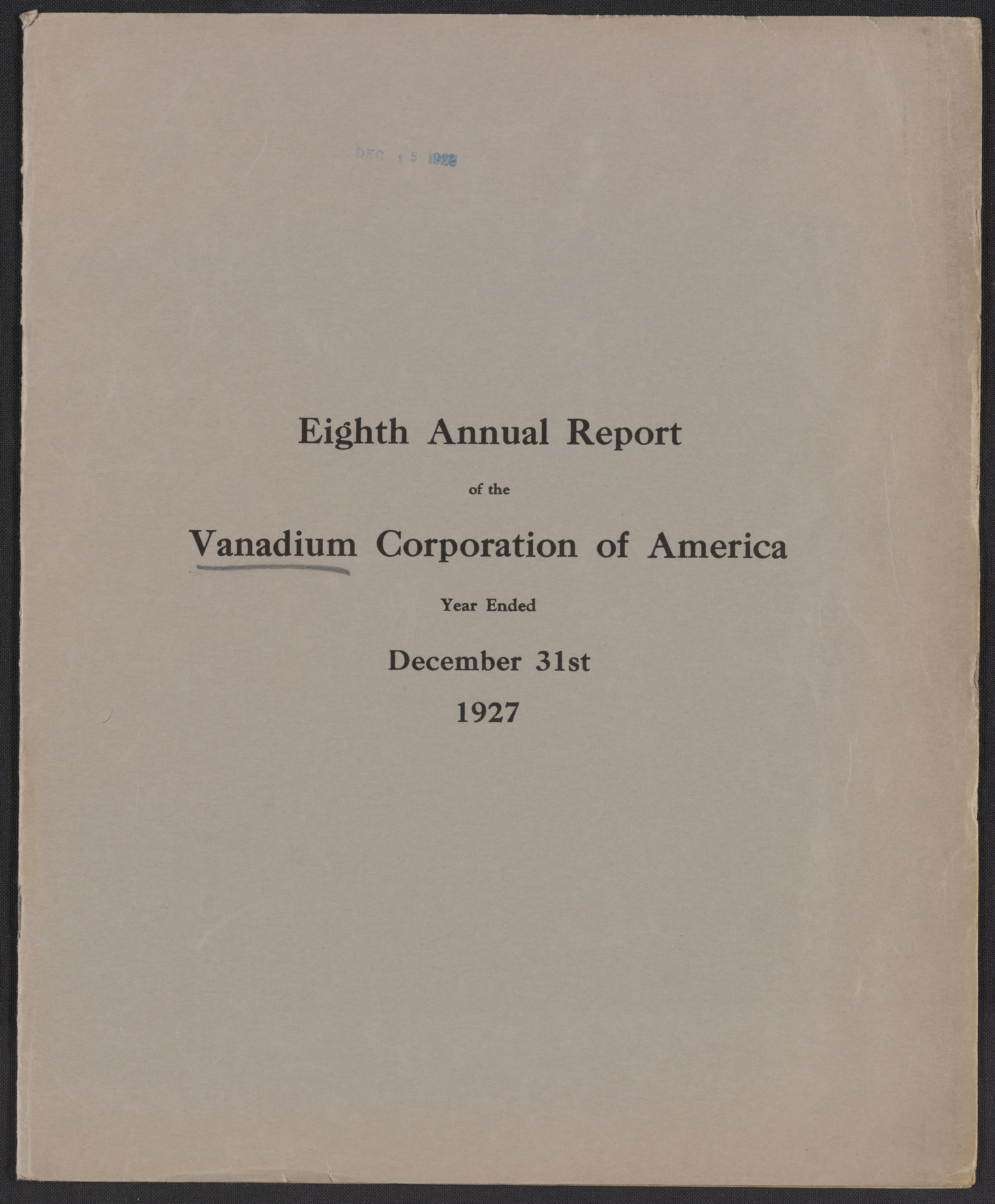 Vanadium Corporation of America. “Eighth Annual Report of the Vanadium Corporation of America Year Ended December 31st 1927.” New York, New York, 1928. https://digital.sciencehistory.org/works/9880vr90q.