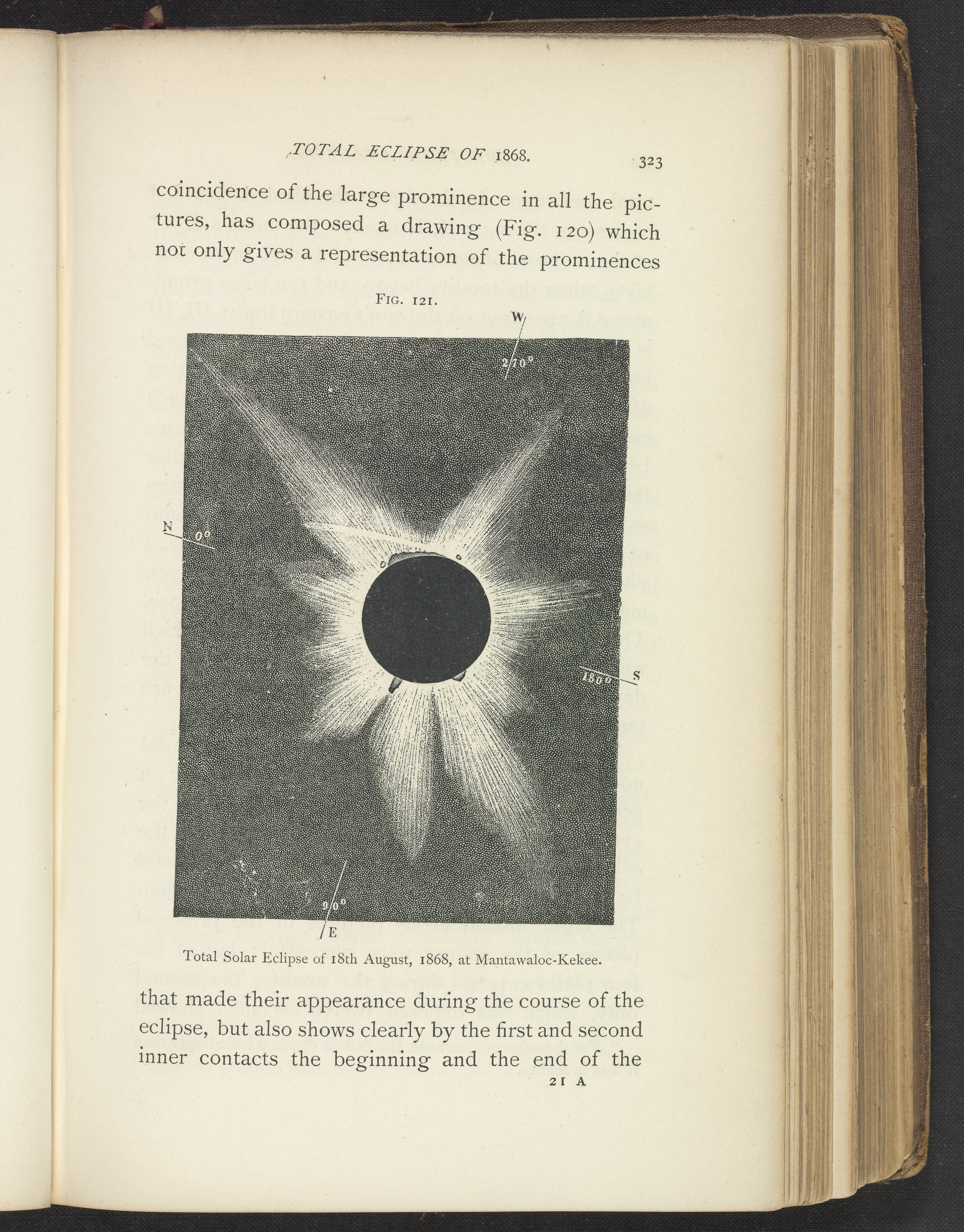 Schellen, Heinrich. “Total Solar Eclipse of 18th August, 1868, at Mantawaloc-Kekee.” Spectrum Analysis in Its Application to Terrestrial Substances, and the Physical Constitution of the Heavenly Bodies. London, England, 1872. Science History Institute. Philadelphia. https://digital.sciencehistory.org/works/9880vs04v.