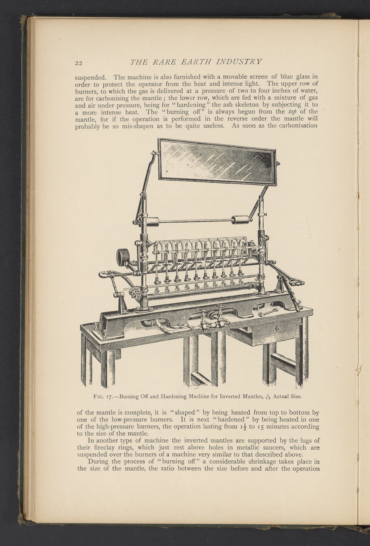 Figure 17 from the 1915 volume The Rare Earth Industry depicting a machine (1/14 actual size) for burning off and hardening inverted mantles, a component of incandescent gas lanterns. The volume details various industrial applications of rare earths and closely-related elements, including thorium, zirconium, tantalum, and tungsten. Particular attention is given to the illuminating effect of the oxides of thorium and cerium and their application to the manufacture of incandescent gas mantles and electric lamps. The volume also includes chapters on uranium and vanadium, as well as the industry of radioactive substances.