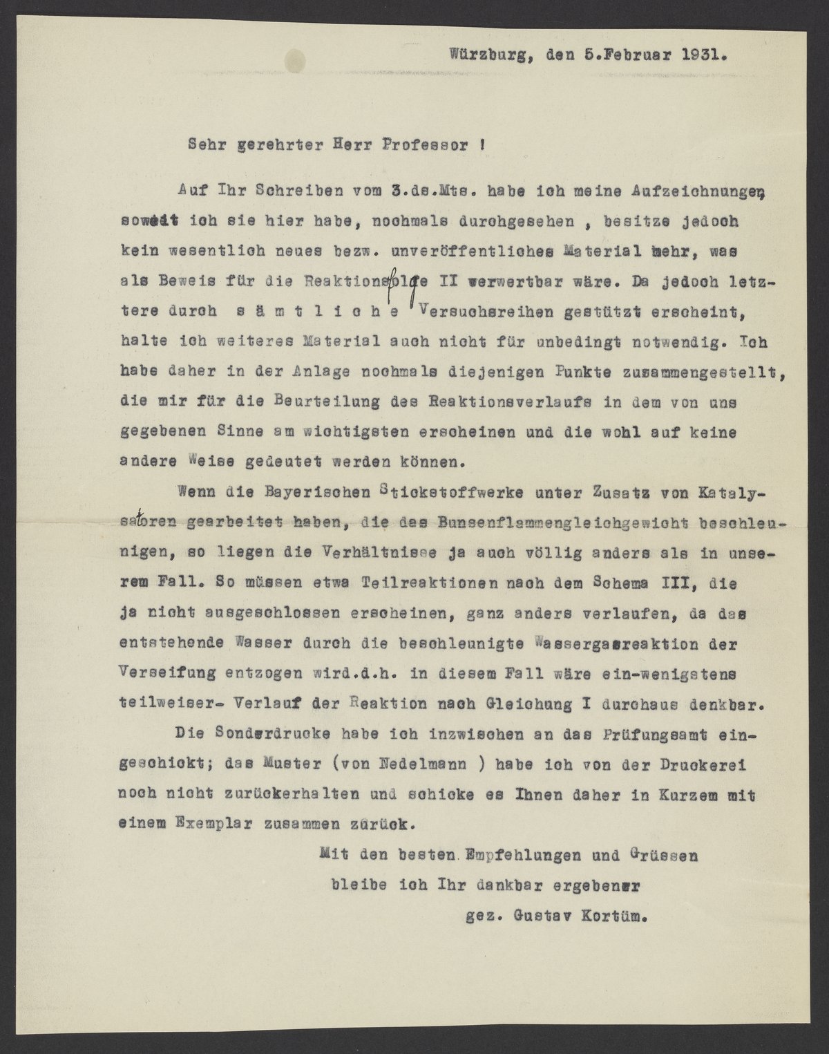 Auf Ihr Schreiben vom 3.ds. Mts. habe ich meine Aufzeichnungen soweit ich sie hier habe, nochmals durchgesehen, besitze jedoch kein wesentlich neues unveröffentlichtes Material mehr, was als Beweis für due Reaktionsfolge II wertbar wäre. Da jedoch letztere durch sämtliche Versuchsreihen gestützt erscheint, halte ich weiteres Material auch nicht für unbedingt notwendig. Ich habe daher in der Anlage nochmals diejenigen Punkte zusammengestellt, die mir für die Beurteilung des Reaktionsverlaufs in dem von uns gegeben Sinne am wichtigsten erscheinen und die wohl auf keine andere Weise gedeutet werden können.