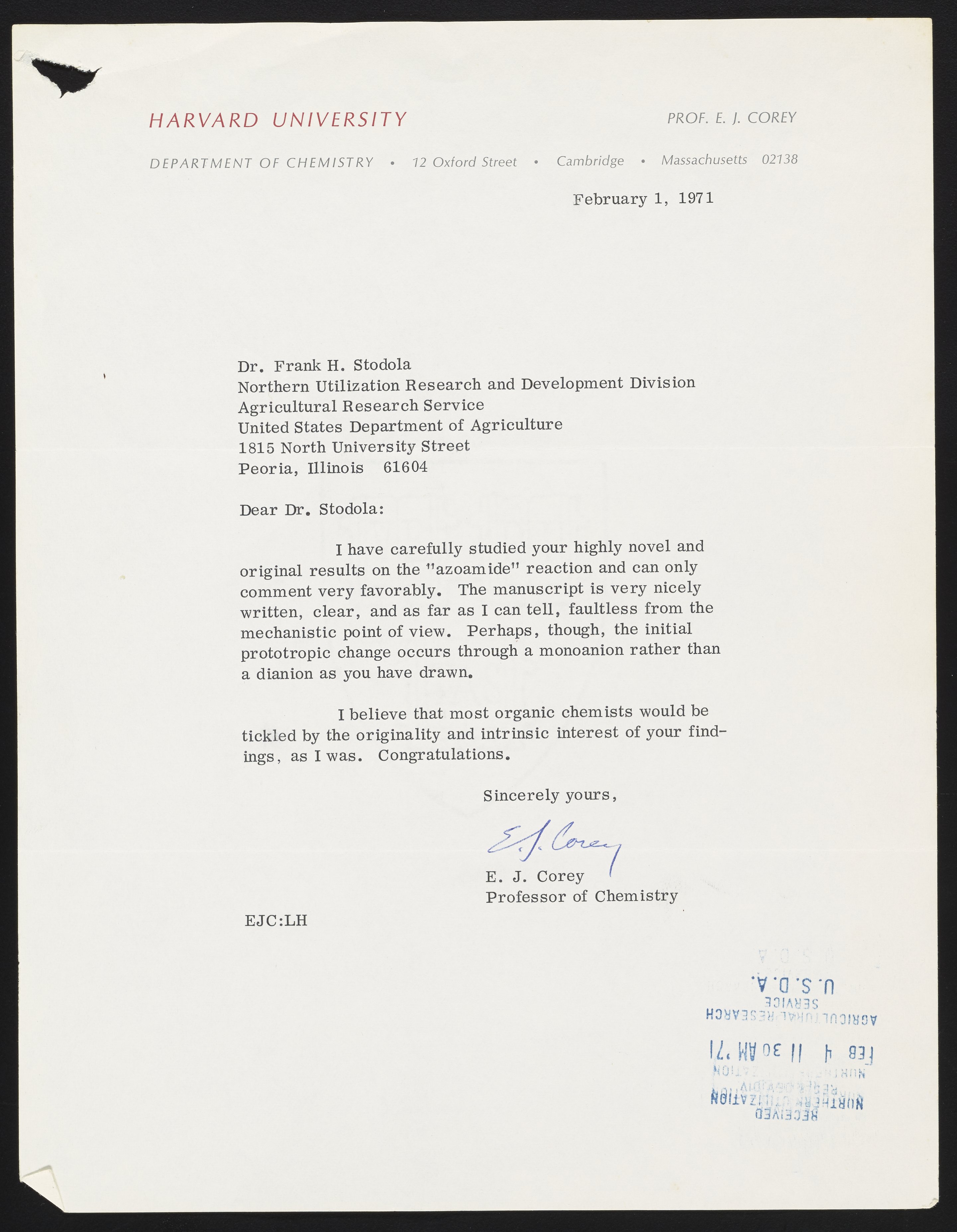 Corey, E. J. “Letter from E. J. Corey to Frank Stodola,” February 1, 1971. Frank H. Stodola Nobel Laureate Letter Collection, Box 1. Science History Institute. Philadelphia. https://digital.sciencehistory.org/works/9c67wm898.