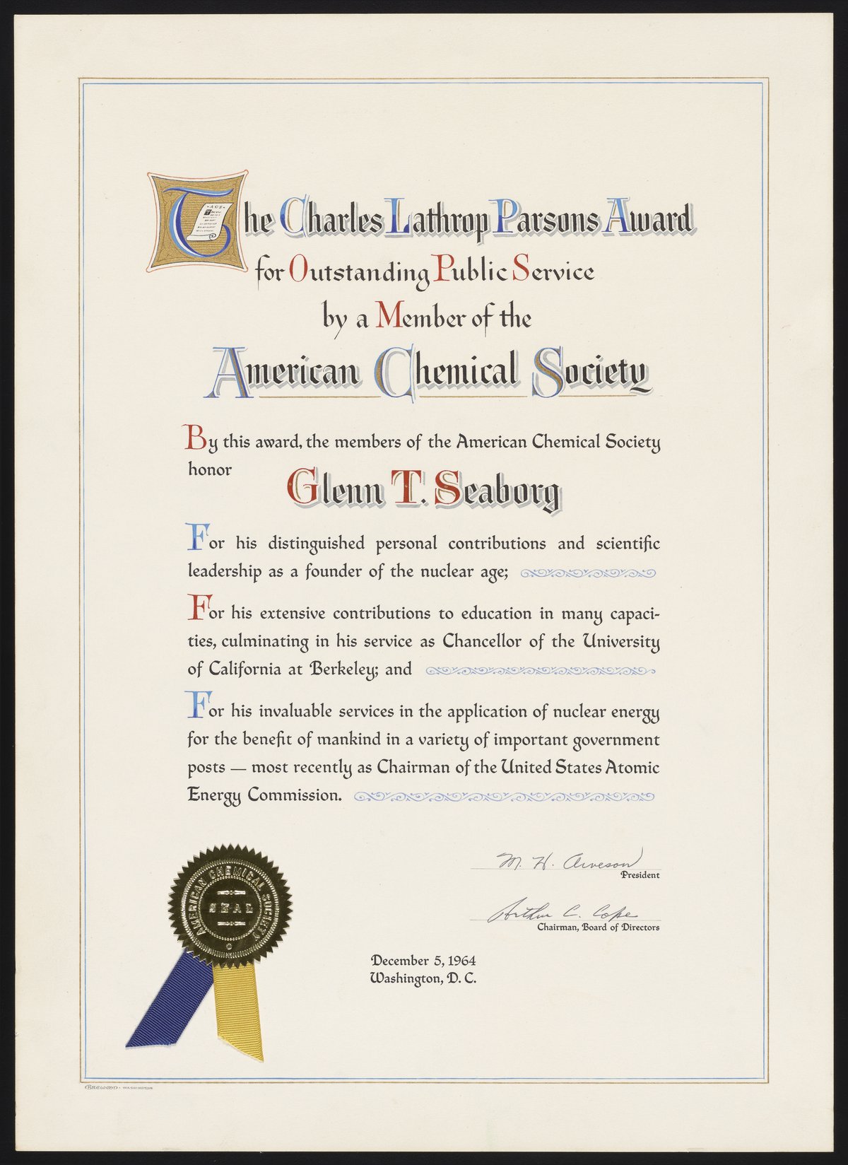 American Chemical Society. “Certificate Presenting Charles Lathrop Parsons Award to Glenn Seaborg,” December 5, 1964. Records of the Lawrence Berkeley National Laboratory - Nuclear Division, Folder 1. Science History Institute. Philadelphia. https://digital.sciencehistory.org/works/9c67wm919.