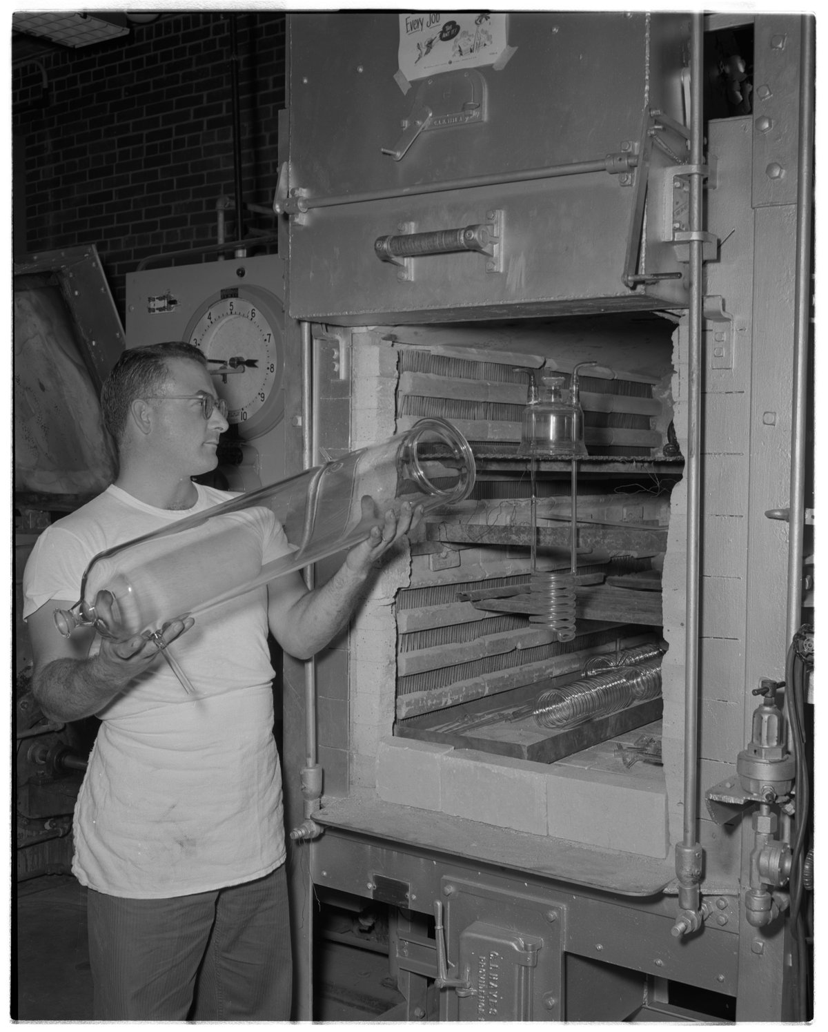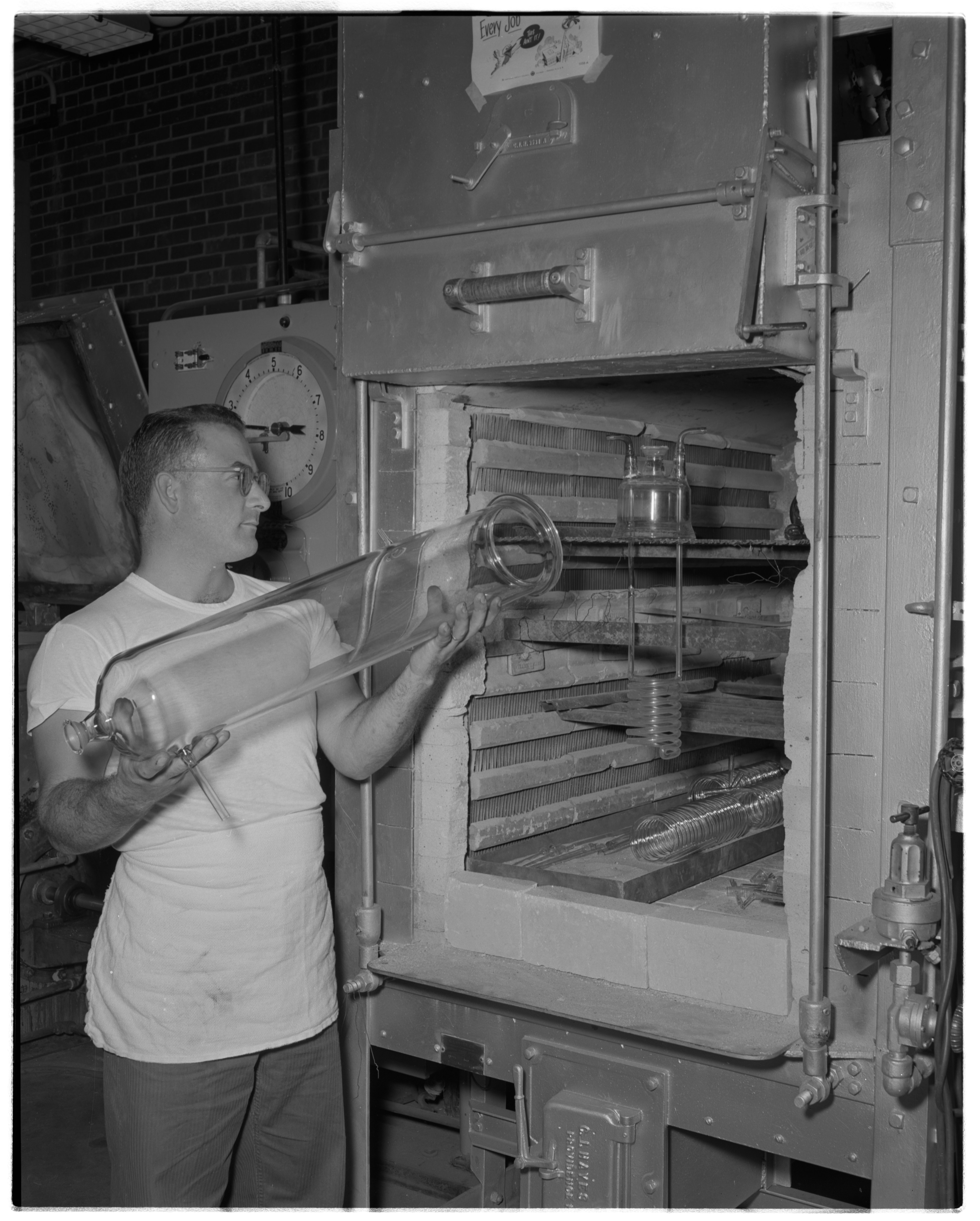 General view of Wayne Doehring placing a glass polymerizer into the annealing furnace in the Dow Chemical Company's Glass Fabrication department. Founded in 1925, the department was responsible for the fabrication and repair of specialty glass equipment used at the Company's plant in Midland, Michigan. Before leaving the department, glass was placed in the furnace to remove any stresses that set up in the glass during fabrication.