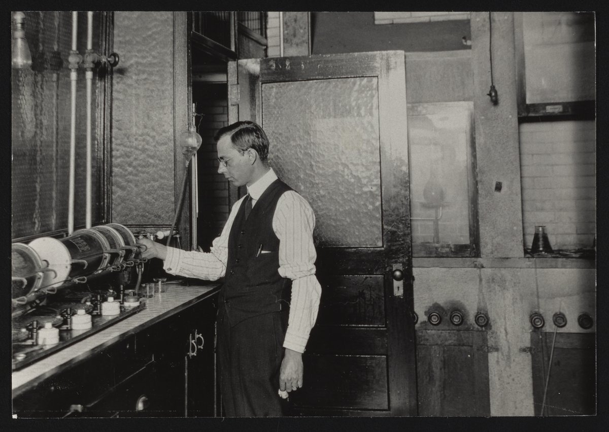 General view of an employee conducting an analysis of an unidentified substance in the Bureau of Chemistry's Nitrogen Laboratory. Part of the U.S. Department of Agriculture, the Nitrogen Laboratory conducted investigations into substances, including nitrogen, hydrogen, and carbon, formed due to the decomposition of food, as well as analyzed the nitrogen content of assorted foods, fertilizers, and cattle feeds.