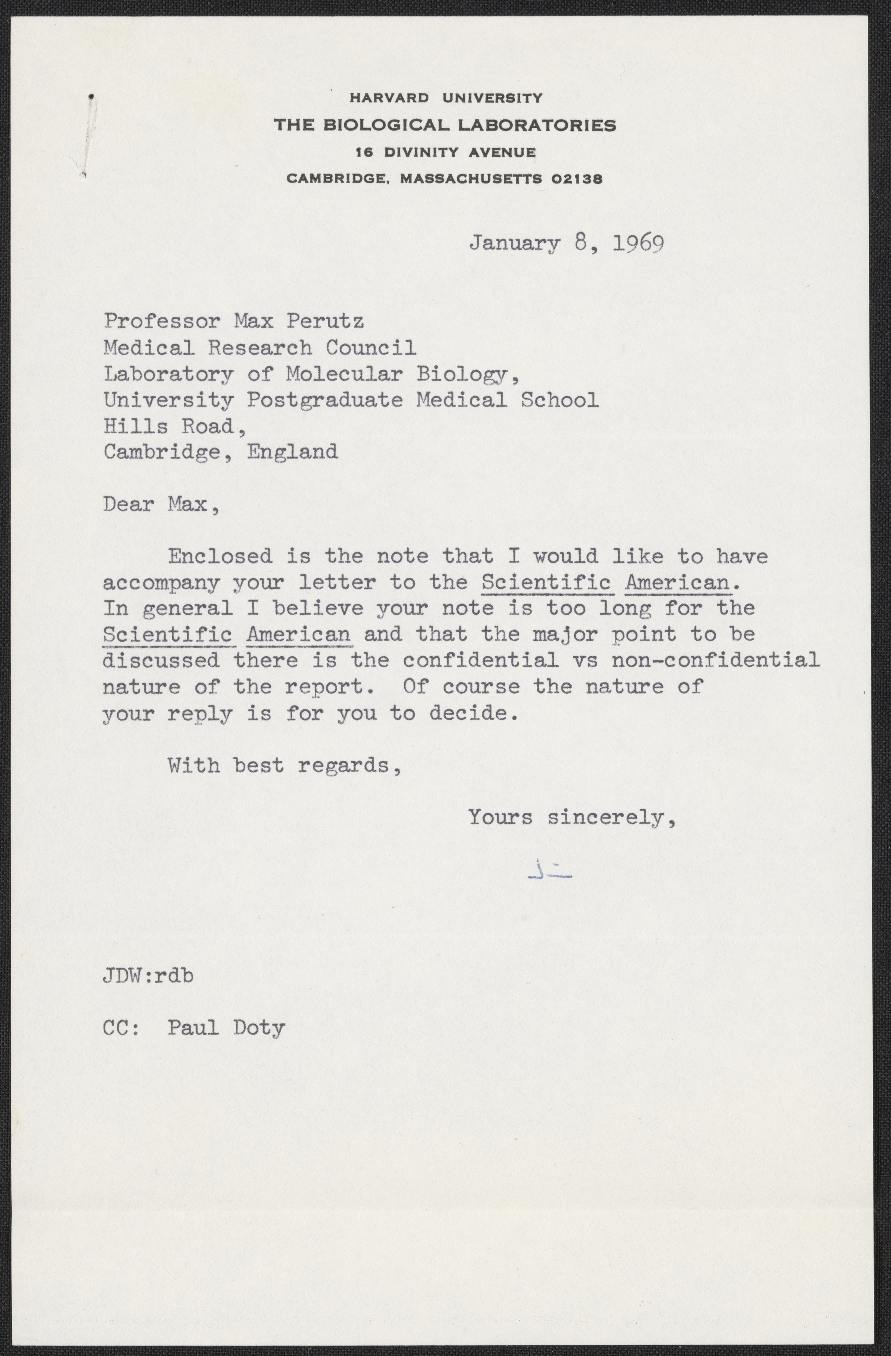 Watson, James D. “Letter from James D. Watson to Max Perutz, January 8, 1969,” January 8, 1969. History of Molecular Biology Collection, Box 88, Folder 3. Science History Institute. Philadelphia. https://digital.sciencehistory.org/works/9cd1ym4.