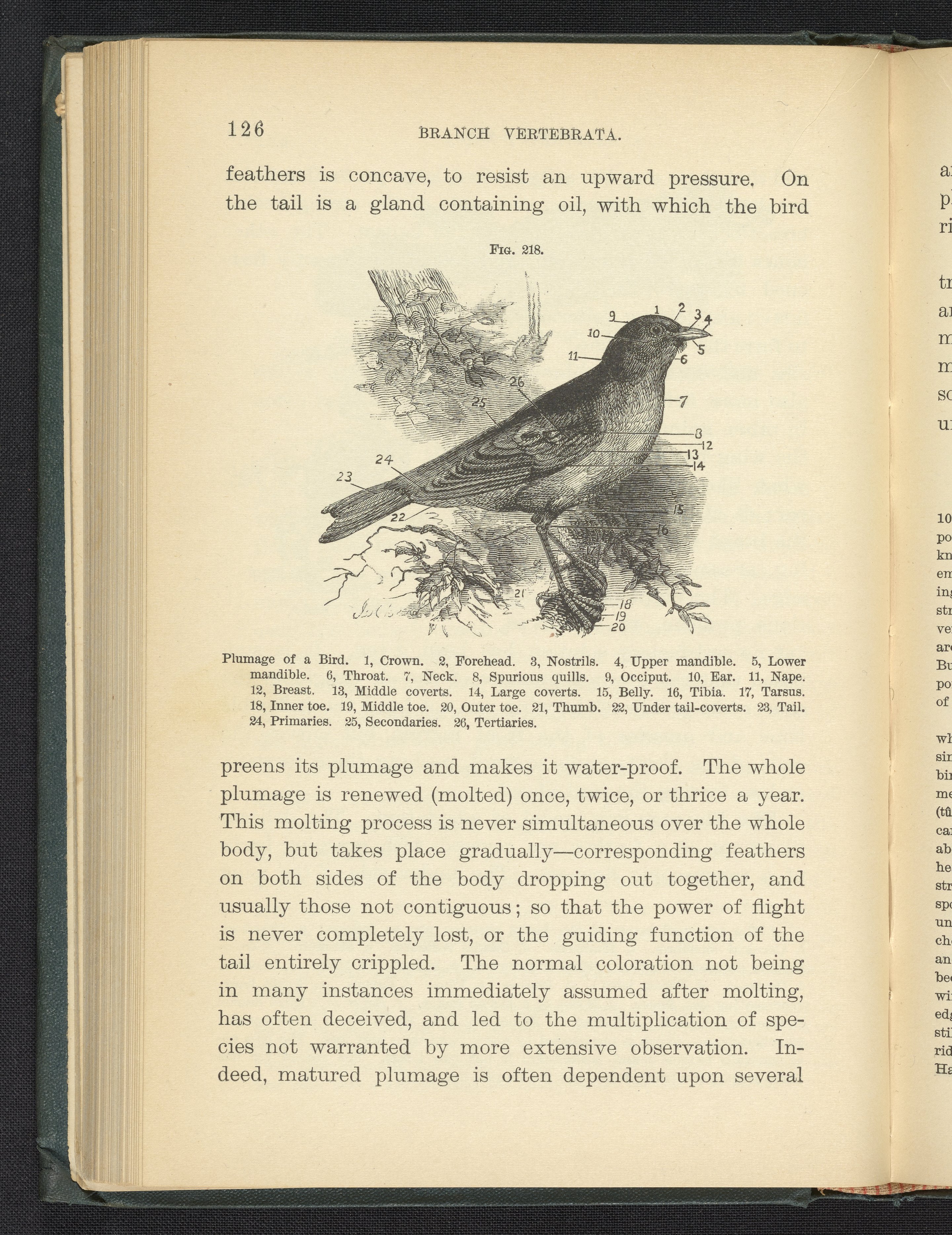 Figure 218 of the 1887 volume Popular Zoology depicting the plumage of a bird, with view of a variety of parts, including the upper and lower mandibles, spurious quills, and tail-coverts.