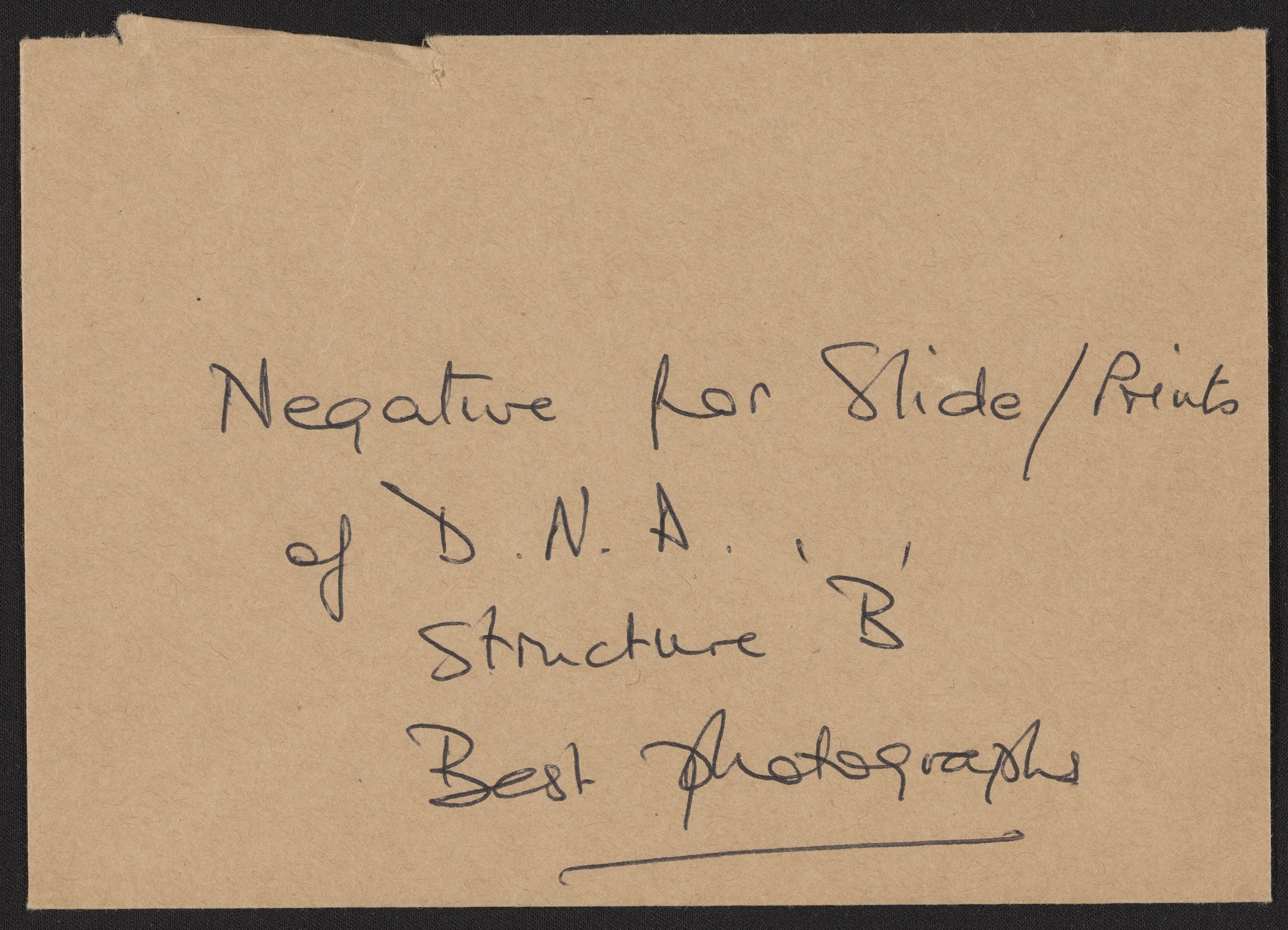 Envelope labeled "Negative for Slide. Prints of D.N.A. Structure 'B' Best Photographs"