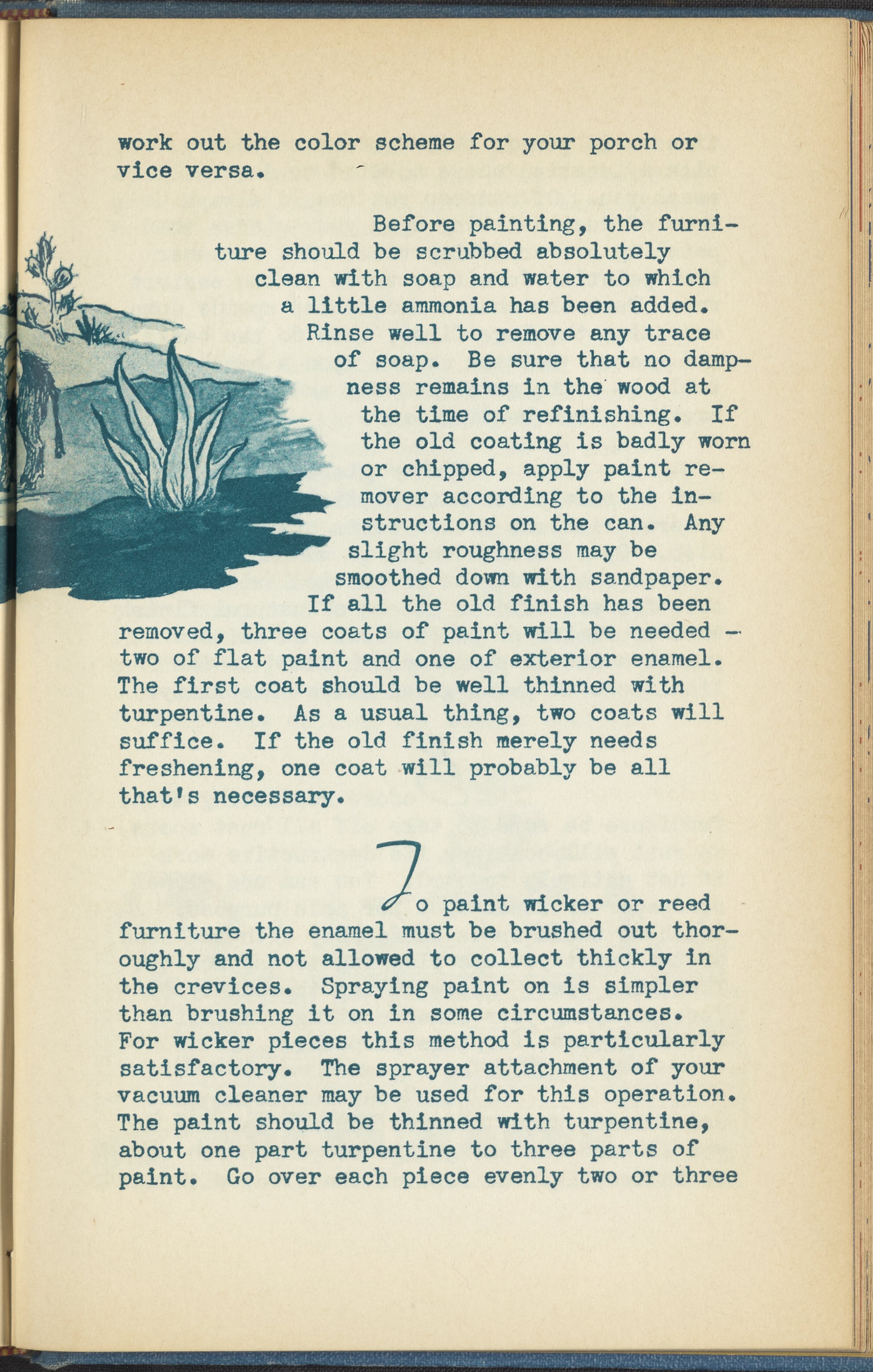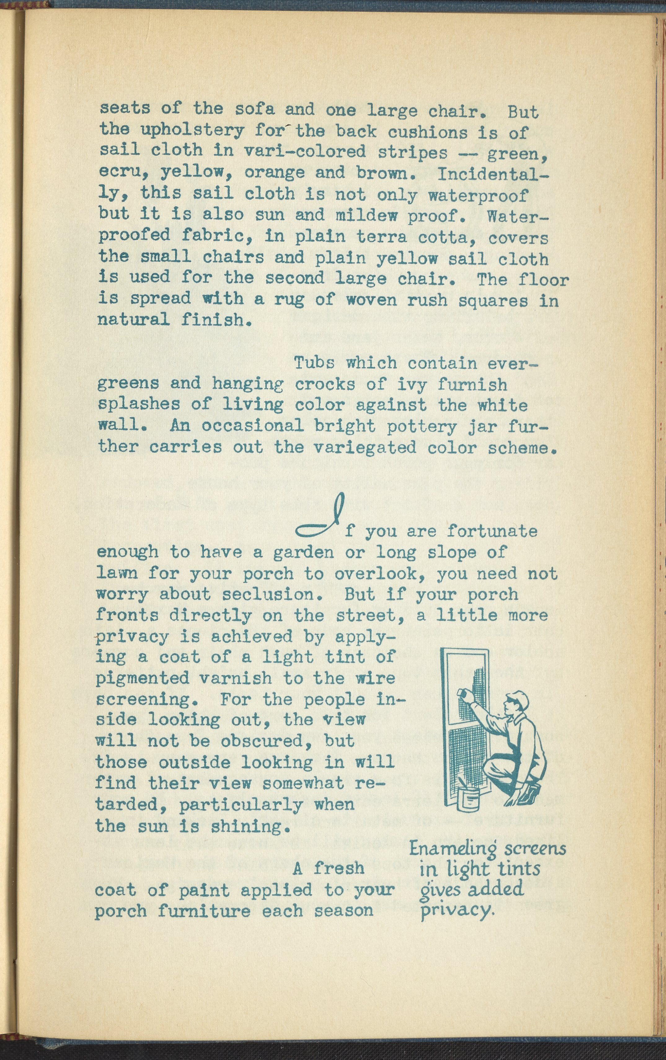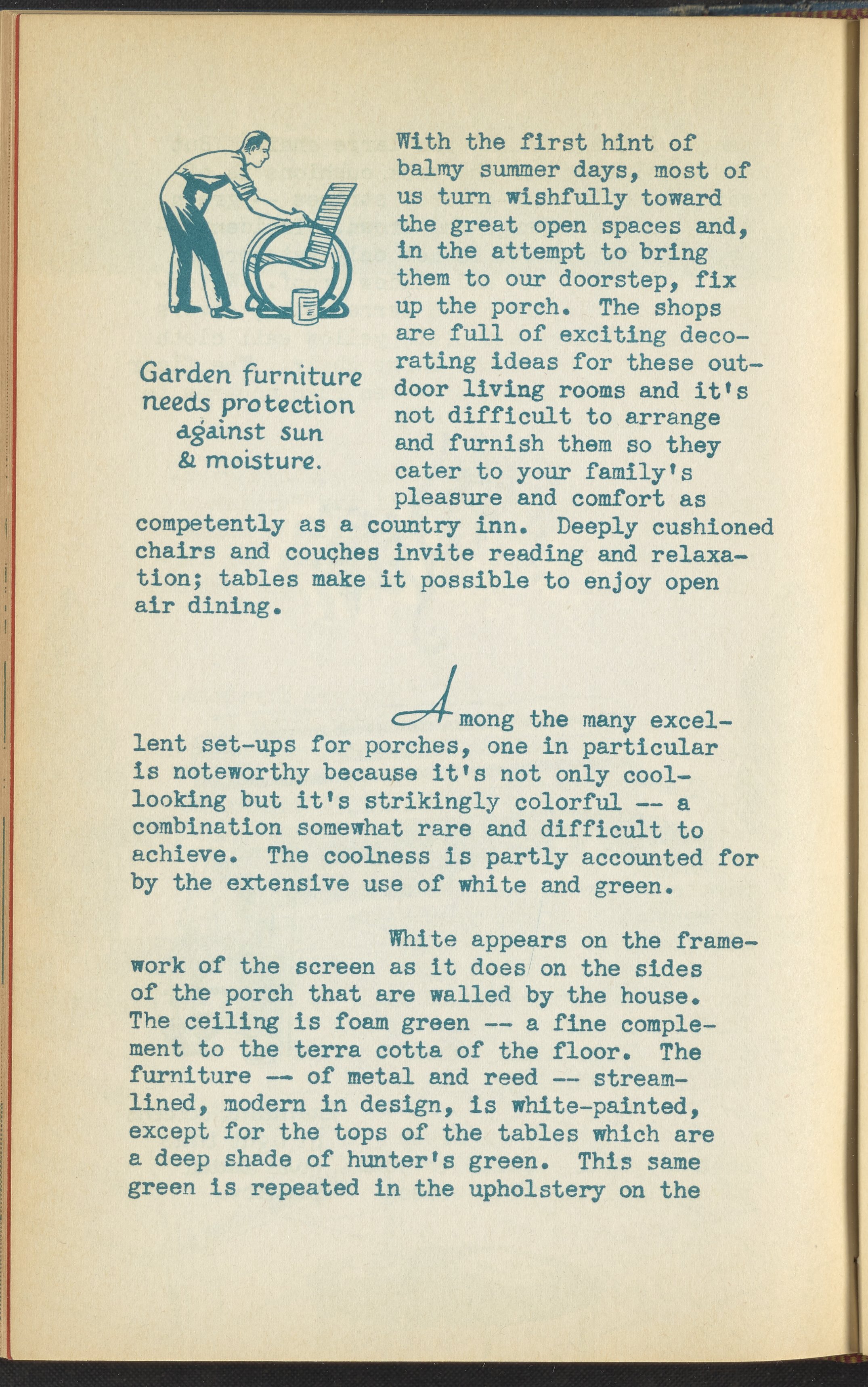 Booklet corresponding to a radio broadcast program created by the National Paint, Varnish, and Lacquer Association. The booklet discusses how to decorate a porch for a home. Provides suggestions for furniture, color schemes, and maintenance of outdoor furniture. Includes instructions for painting outdoor furniture and describes a porch for inspiration. Includes small stylized illustrations throughout and decorated covers.