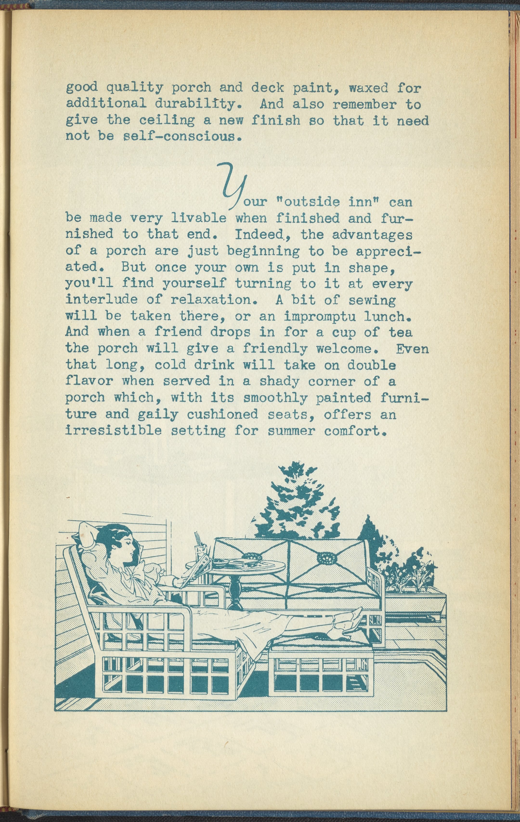 Booklet corresponding to a radio broadcast program created by the National Paint, Varnish, and Lacquer Association. The booklet discusses how to decorate a porch for a home. Provides suggestions for furniture, color schemes, and maintenance of outdoor furniture. Includes instructions for painting outdoor furniture and describes a porch for inspiration. Includes small stylized illustrations throughout and decorated covers.