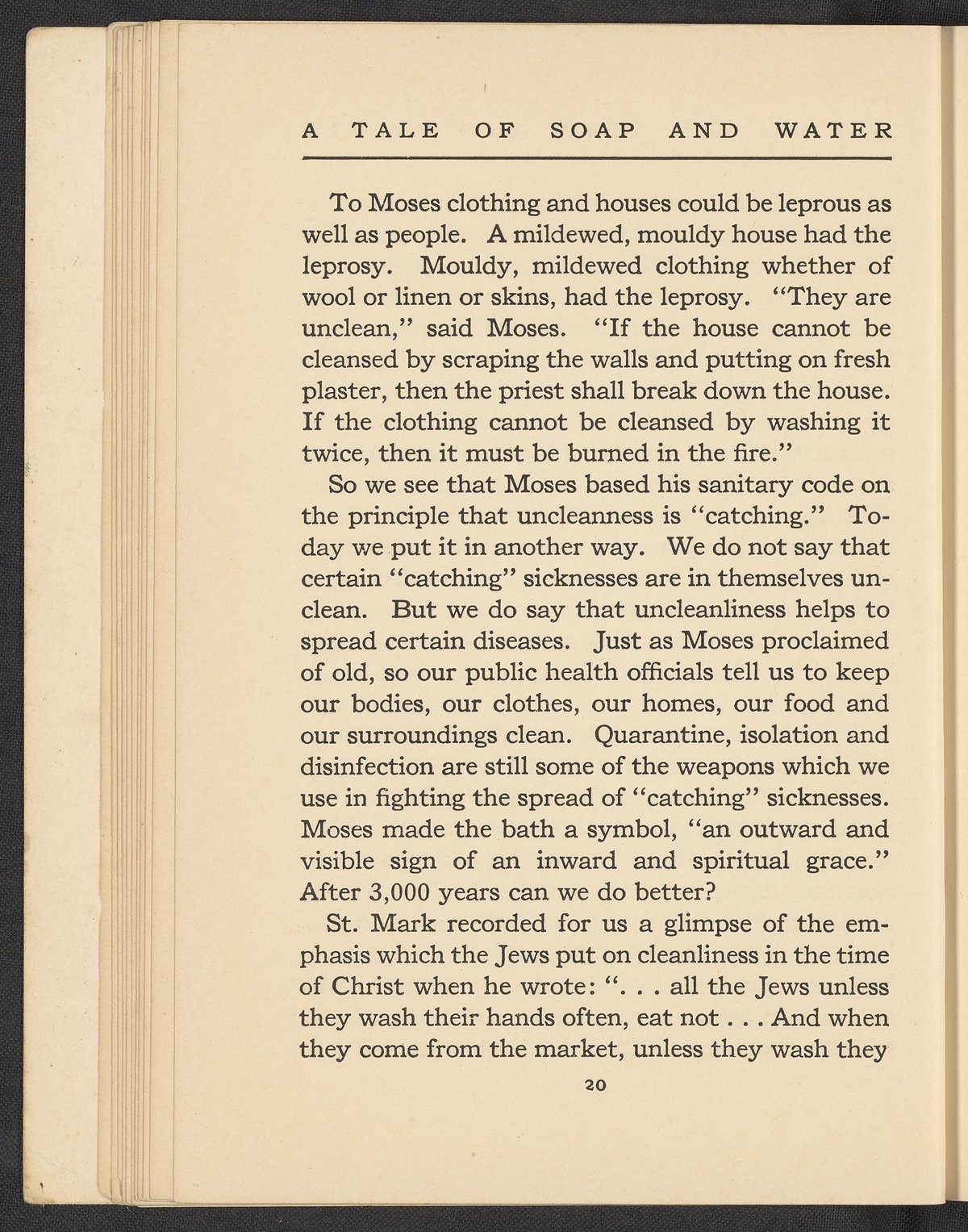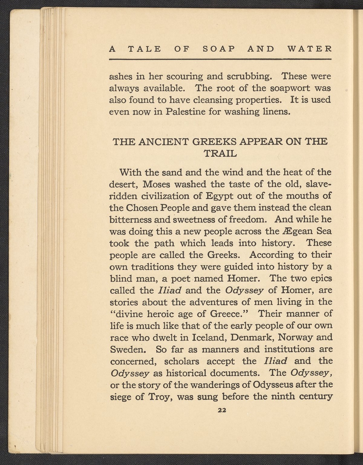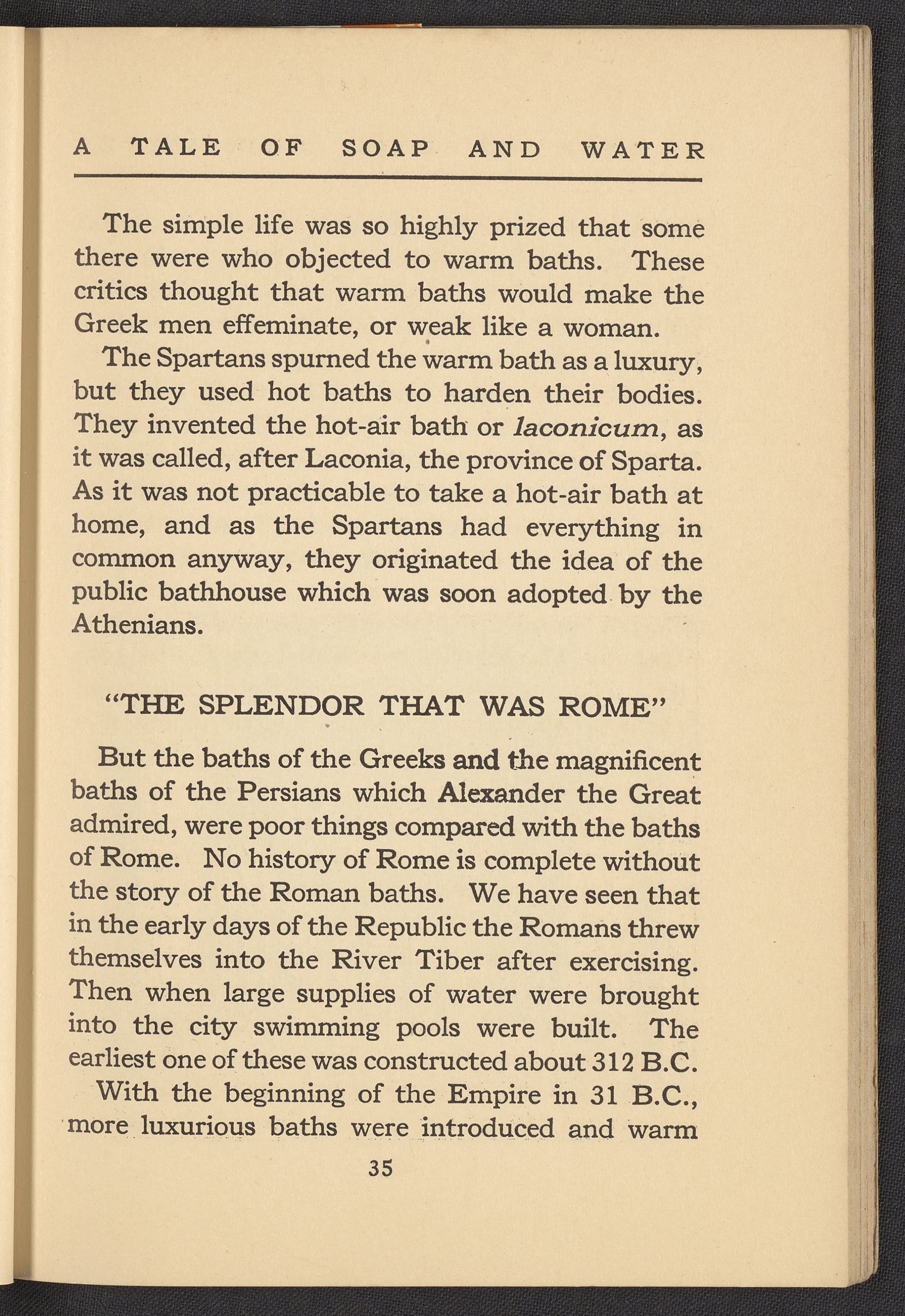 Small JPG1200 x 1626px — 471 KBFull-sized JPG2286 x 3098px — 1.5 MBOriginal fileTIFF — 2286 x 3098px — 20.3 MBA history of bathing and personal hygiene from the prehistoric age to present day. The author describes the religious and cultural significance of bathing around the world and describes methods of bathing used by various groups of people, from ancient Egyptians to early American settlers. The work concludes with a description of the chemistry of modern soap and the value of cleanliness among modern Americans.