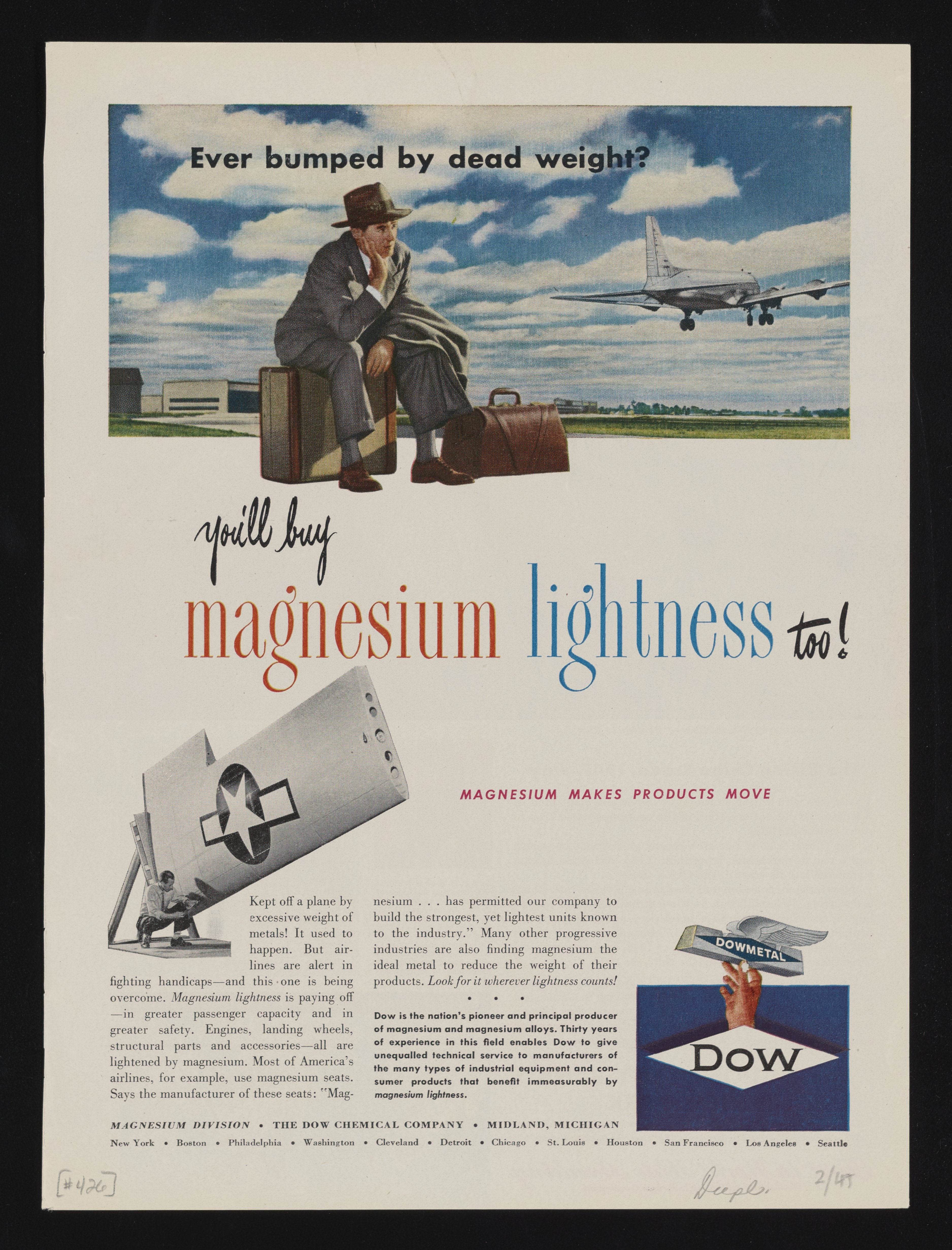 Color print advertisement for Dowmetal, a magnesium alloy manufactured and sold by the Dow Chemical Company. Depicts a downcast man sitting on his luggage while a plane departs in the background. A second image shows a man working on an airplane wing, next to which accompanying text describes how heavy luggage could affect one's airline travel. The use of magnesium to manufacture lightweight and durable airline parts allows greater passenger capacity and weight allowance. The Dowmetal logo, a hand holding a winged ingot of magnesium, is located in the bottom right of the advertisement.