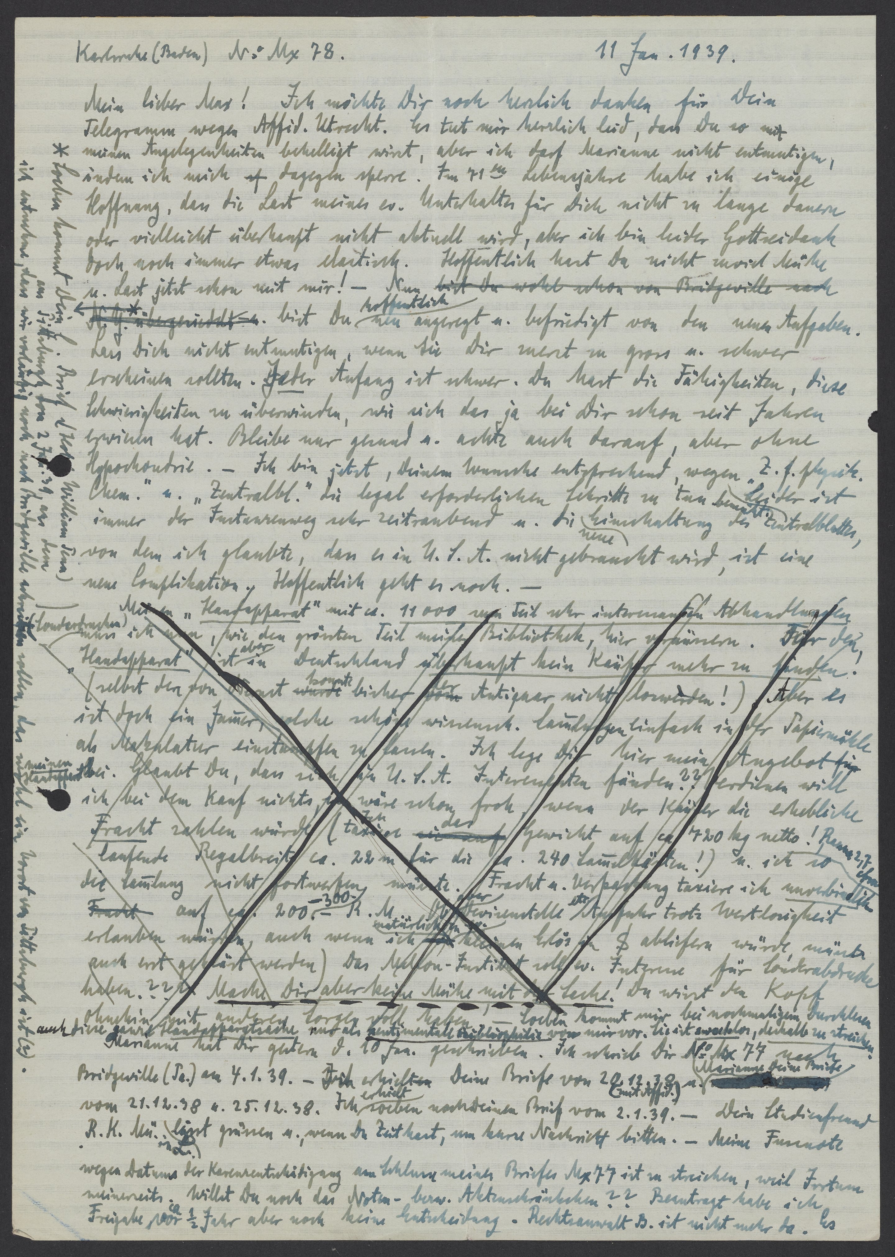 Marianne hat Dir gestern d. 10 Jan. geschrieben. Ich schrieb Dir No. Max 77 nach Bridgeville, PA am 4.1.39. Ich erhielt Deine Briefe vom 2.1.39. Dein Studienfreund R.K. Mü. lässt grüssen, u. wenn Du Zeit hast, um kurze Nachricht bitten. Meine Fussnote wegen Datums der Karenzentschädigung am Schluss meines Briefes Mx 77 ist zu streichen, weil Irrtum meinerseits. Willst Du noch das Noten – bezw. Aktenschränkchen?? Beantragt habe ich Freigabe vor ca. ½ Jahr aber noch keine Entscheidung. Rechtanwalt B. ist nicht mehr da.